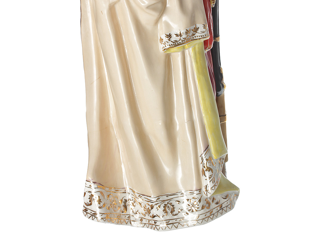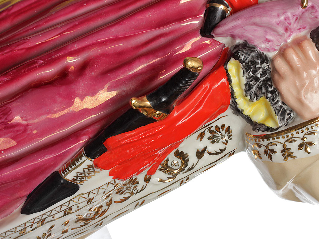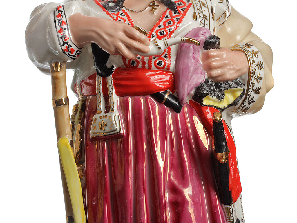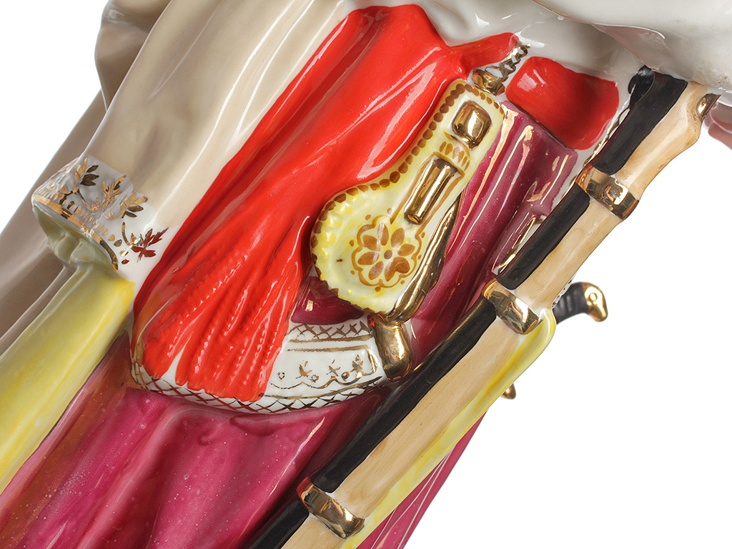 Данная фигура выпускалась в двух размерах (23 см. и 48 см.) и нескольких вариантах исполнения, отличавшихся качеством росписи соответственно сорту. Представленный экземпляр отличается высоким качеством изготовления, что в сочетании с индивидуальной художественной росписью и впечатляющим размером делает его интерьерным произведением искусства.