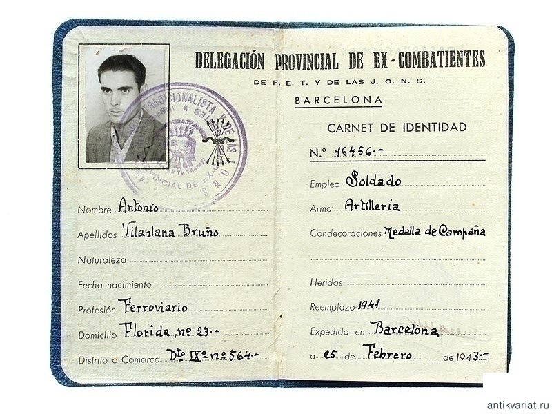 Удостоверение личности бойца испанской "Голубой дивизии", сражавшейся на Восточном фронте. К удостоверению прилагаются форменная пряжка и нашивка, вышитая машинным способом на шелковой основе.