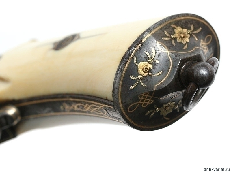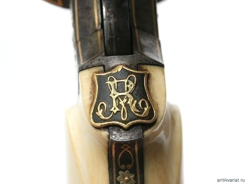 Все металлические части - ствол, барабан, рама револьвера богато и очень красиво украшены инкрустацией золотом разных цветов - от лимонного до оранжевого. В мотиве украшений доминирует растительный и цветочный орнамент. Под курком, на спинке рукояти, помещен геральдический щит с монограммой владельца: "R.Y.". Накладки рукояти из полированной слоновой кости, со временем приобретшей красивый желтоватый оттенок. Золотом украшена абсолютно вся поверхность - вплоть до крепежных винтов накладок рукояти и ее основания.