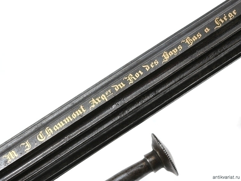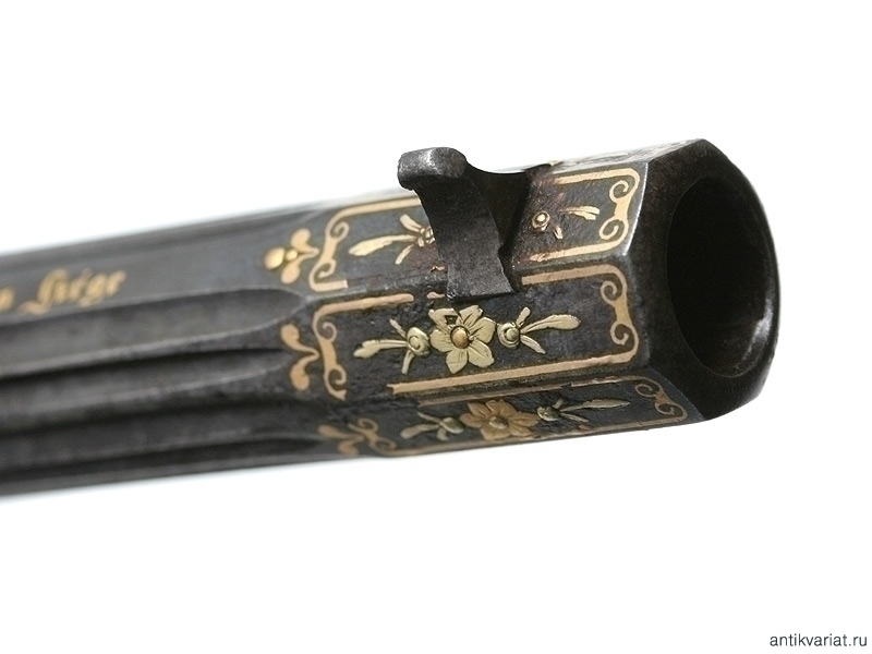 Чрезвычайно нарядный, полностью инкрустированный шестизарядный револьвер системы известного французского оружейника Лефоше, изготовленный в середине XIX века бельгийским оружейным мастером Шомоном (M.J.Chaumont). Полированная поверхность ствола , рама и барабан покрыты иссиня-черным воронением цвета воронова крыла. Ствол имеет продольные проточки, делающие его похожим на ствол средневековой пушки. На спинке ствола - наведенная золотом надпись: "M.J.Chaumont Arqer du Roi des Pays Bas a Liege" - Шомон, королевский оружейник из Льежа.