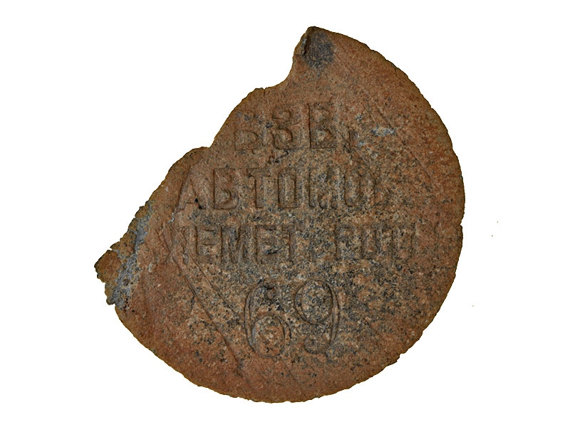 Личный увольнительный жетон рядового либо унтер-офицера автомобильно-пулеметной роты периода Первой мировой войны. Номер взвода не сохранился, личный номер - "69". Цинковый сплав.