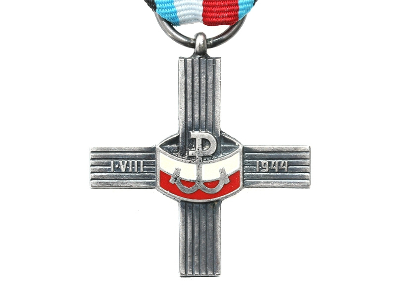 Памятный крест участника Варшавского восстания 1 августа 1944 года. Белый металл, серебрение, эмаль. На оригинальной ленте. Очень хорошее состояние.