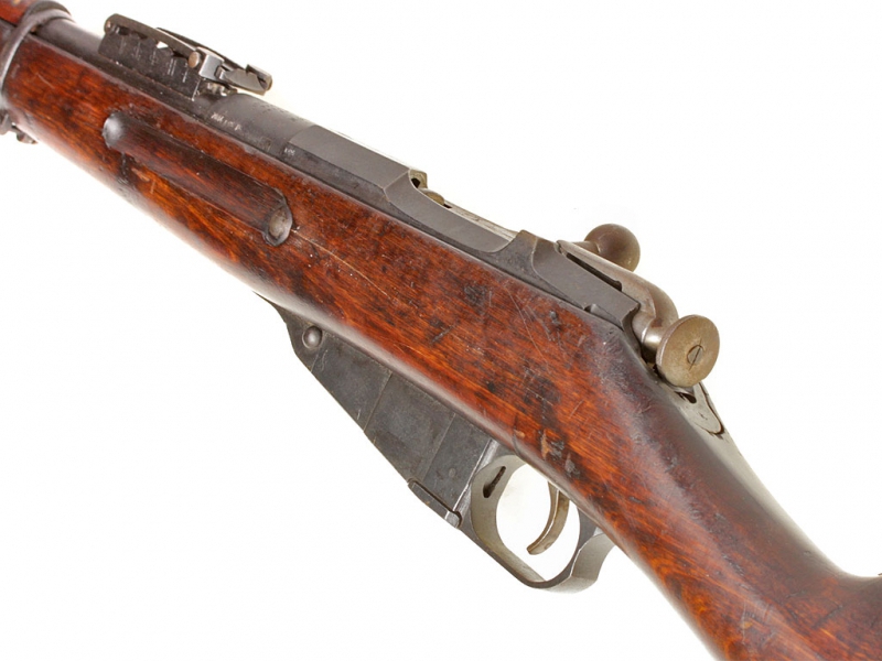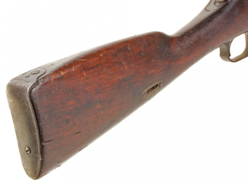 Винтовка системы Мосина, изготовленная на Императорском Тульском оружейном заводе в 1898 году. С прицельной планкой конструкции В.П.Коновалова (результат модернизации 1910 года - в связи с переходом на патроны с остроконечной пулей взамен тупоконечной), ствольная коробка и затвор на разных номерах. На ствольной коробке слева имеется клеймо "SA" (после развала Российской империи винтовка попала в финский арсенал и использовалась в финской армии). Игольчатый штык в комплекте.