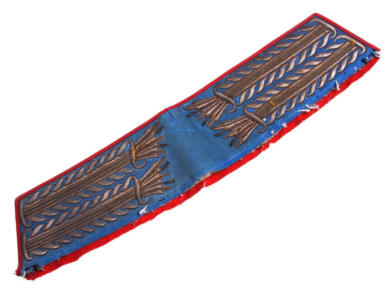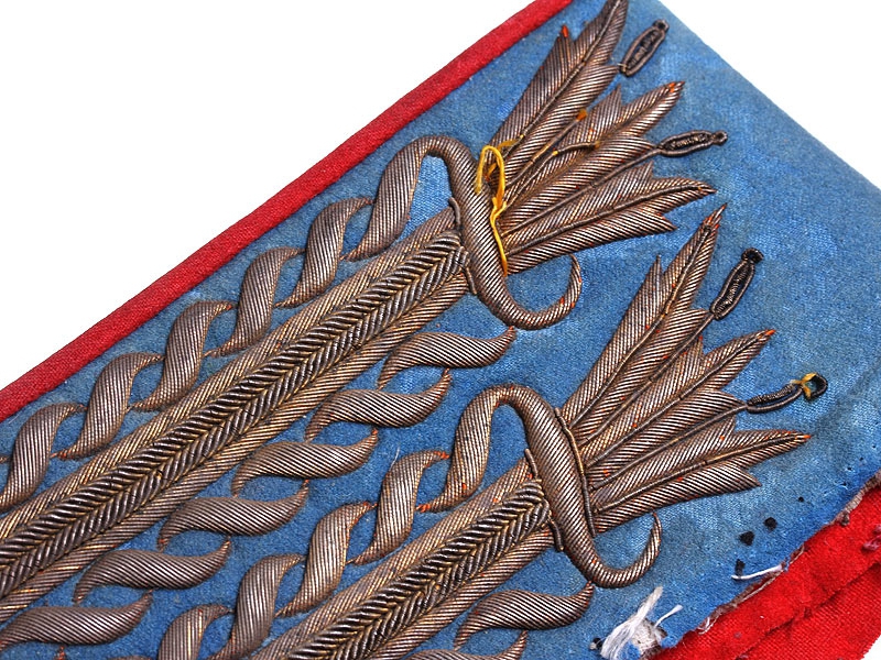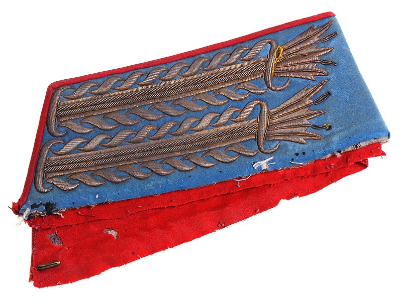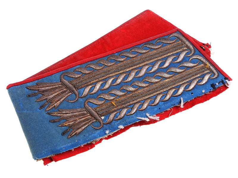 Воротник мундира офицера Лейб-Гвардии Семеновского полка. Золотое шитье на васильковом фоне, красный кант. Изнанка имеет незначительные повреждения от моли. Подойдет для реставрации мундира.