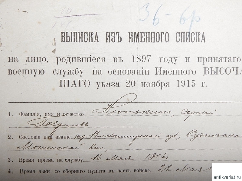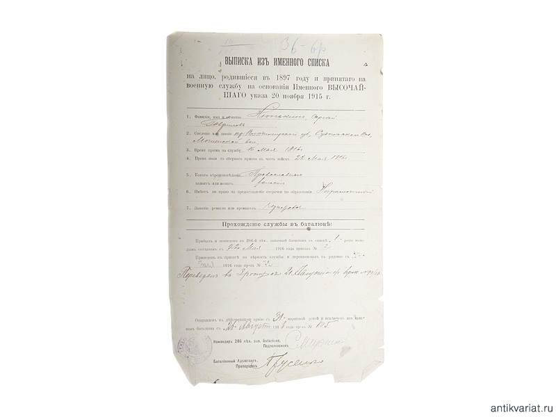 Выписка из именного списка о прохождении службы в пехотном запасном батальоне и убытии на фронт. Датирована августом 1916 года.