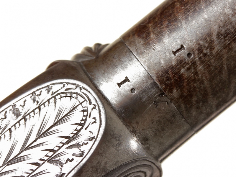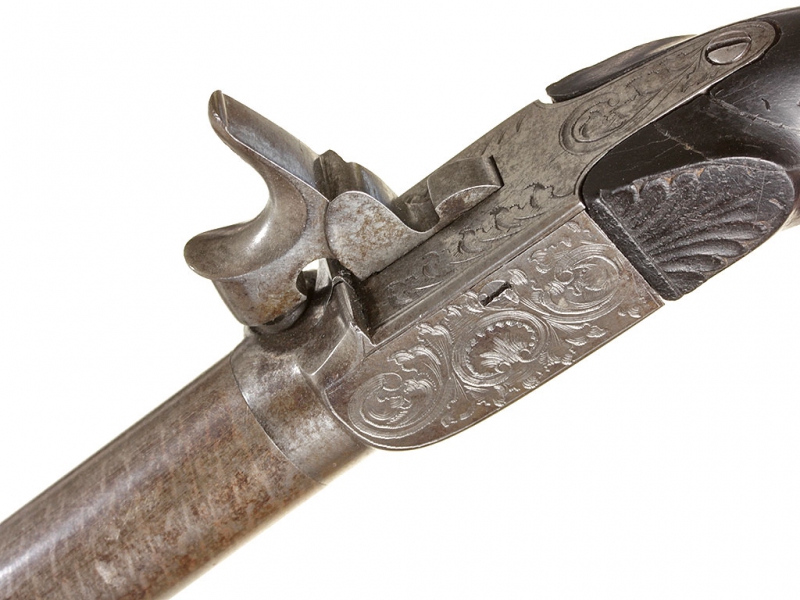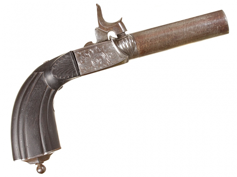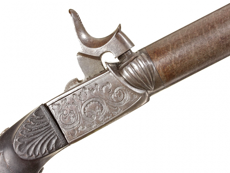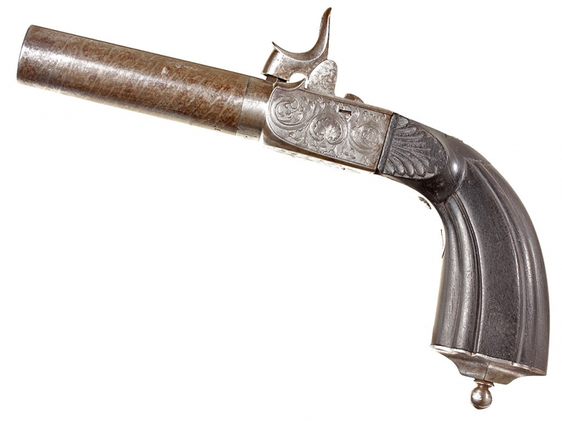 Миниатюрный жилетный пистолет с капсюльным замком, изготовленный в середине XIX века - классическое оружие самообороны для гражданских лиц. Ствол отвинчивается (для удобства чистки), у основания ствола - приемочные клейма. Рама с обеих сторон украшена гравированным орнаментом. Ствол дамаскированный. Рукоять из черного дерева. Спусковой крючок раскладывается при полном взведении курка. Механизм полностью исправен, очень хорошее состояние.