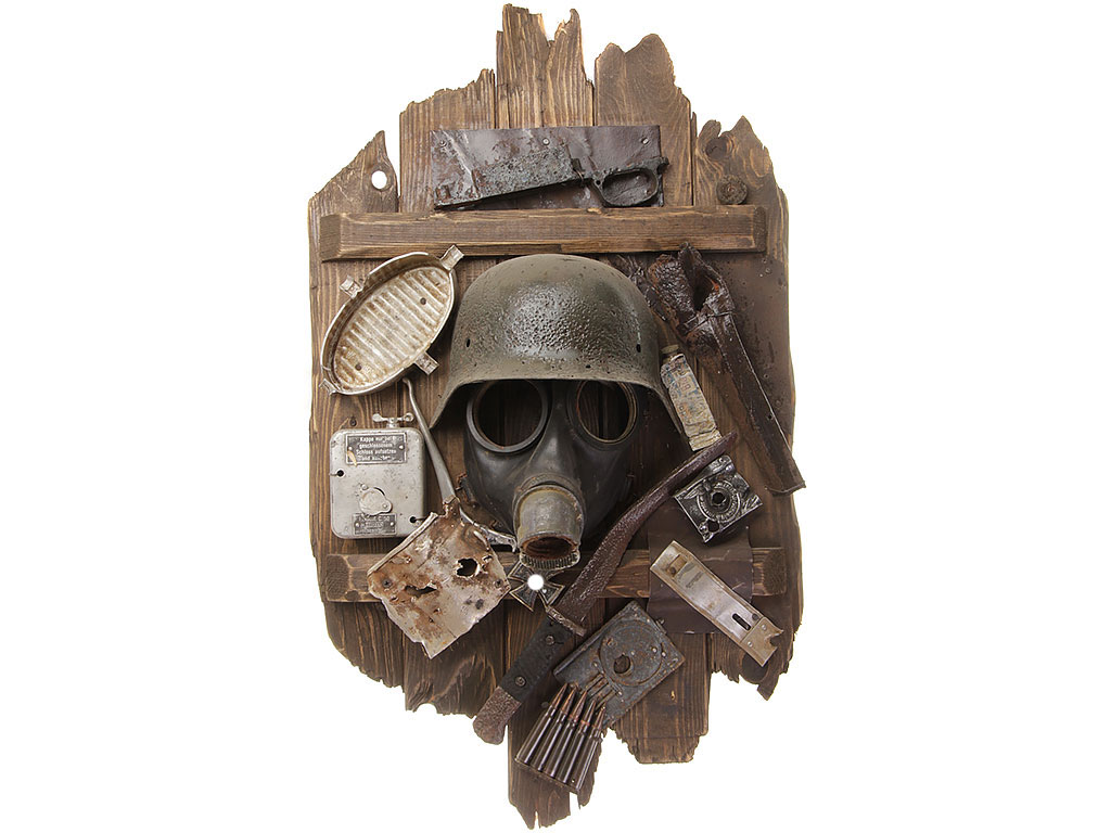Крупное интерьерное панно, с большим художественным вкусом собранное талантливыми руками из различного военного мусора, закрепленного на деревянной основе.