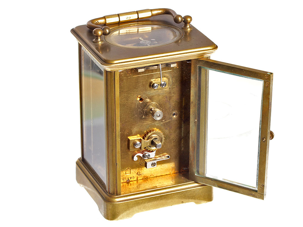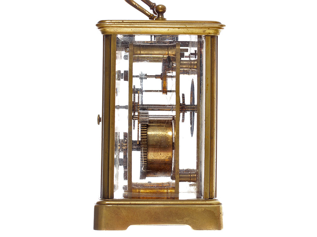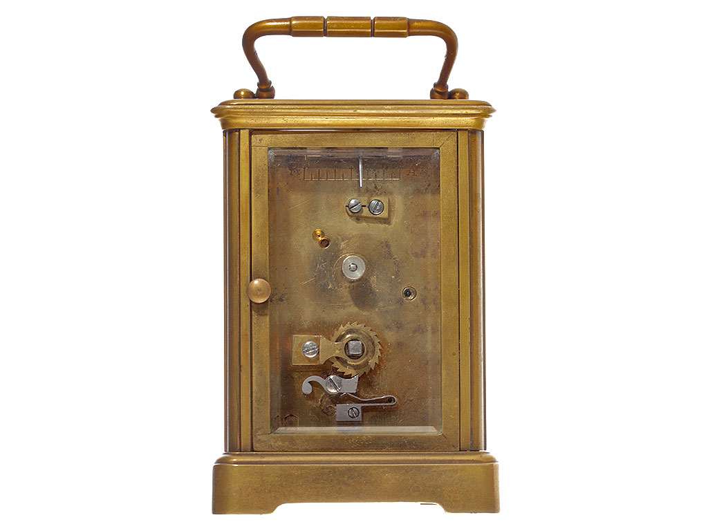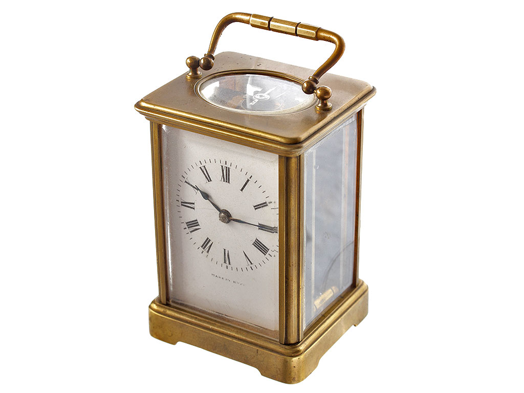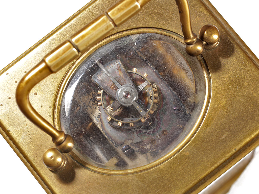 Дорожные (так называемые "каретные") часы, изготовленные в начале ХХ века. Латунный корпус имеет в верхней части подвижную фигурную ручку для переноски, застеклен со всех сторон. Стекла с фацетом, в верхней грани корпуса - дополнительное овальное застекленное окошко, через которое виден баланс часового механизма. Циферблат фарфоровый, с римскими цифрами. В нижней части циферблата - клеймо известного часового дома "Павелъ Буре". В представленном случае (как и всегда с интерьерными часами) Буре выступал в качестве ритейлера, закупая готовые механизмы за границей (в данном варианте - во Франции). Оригинальные вороненые стрелки. Противоположная циферблату сторона корпуса представляет собой застекленную дверку, открывающую доступ к механизму. Механизм заводится ключом (ключ в комплекте) и имеет регулировку точности хода.