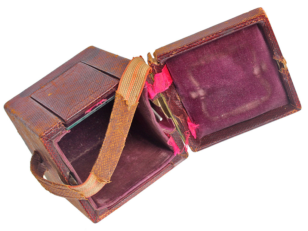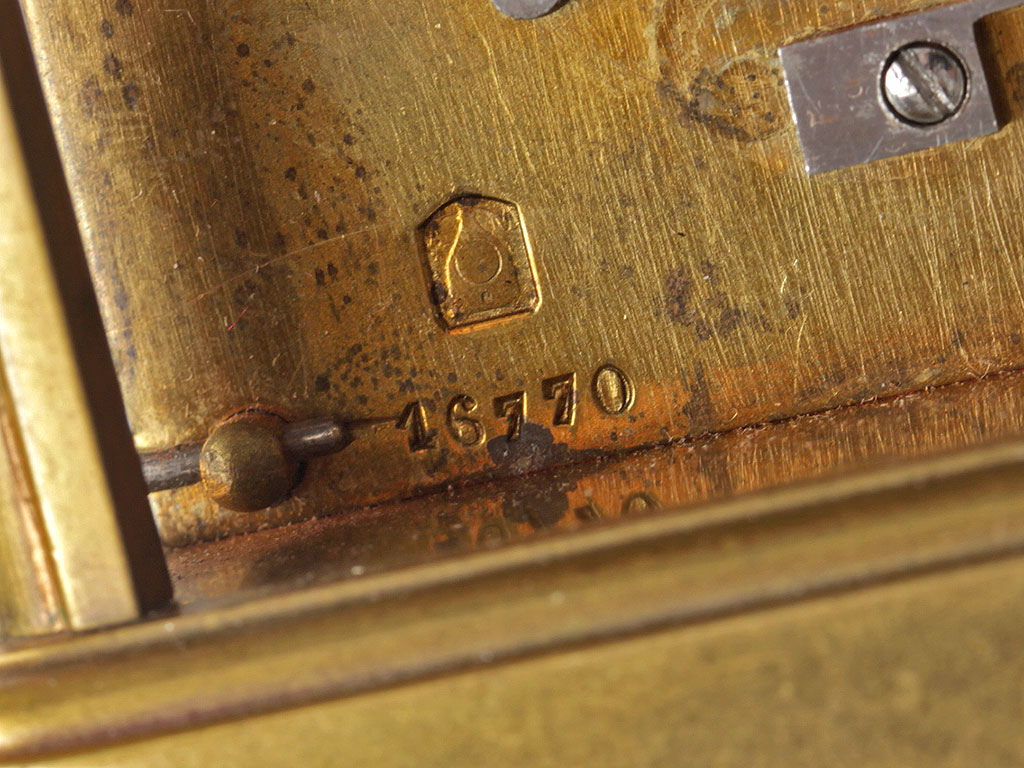 Часы в хорошо сохранившемся оригинальном дорожном футляре, предохраняющем хрупкую конструкцию от повреждений при ударах и падении. Внутренняя часть имеет мягкую бархатную подложку, в специальном боковом кармашке хранится заводной ключ. Передняя дверка футляра вынимается, открывая застекленный циферблат. Футляр имеет кнопочную застежку и ручку для ношения.