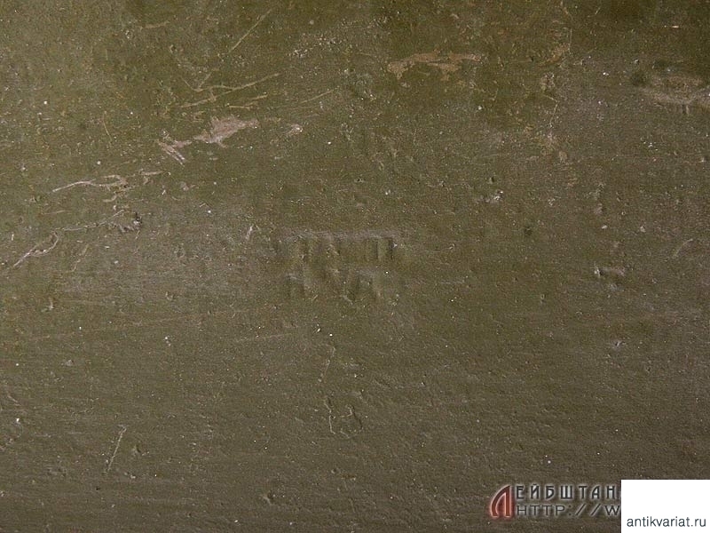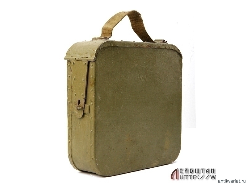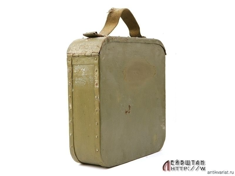 Металлический патронный ящик для лент к станковому пулемету Максим в очень хорошем состоянии. Хранился на советских военных складах, поэтому поверхность покрыта многочисленными слоями армейской зеленой краски. Под красочным слоем присутствуют дореволюционные клейма. Ящик укомплектован советской пулеметной лентой.