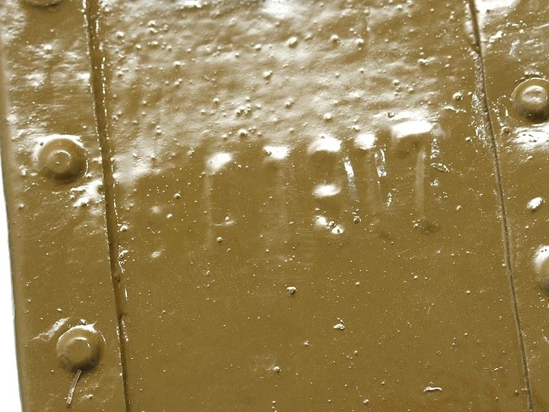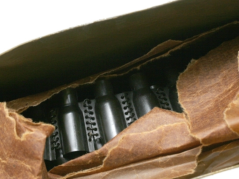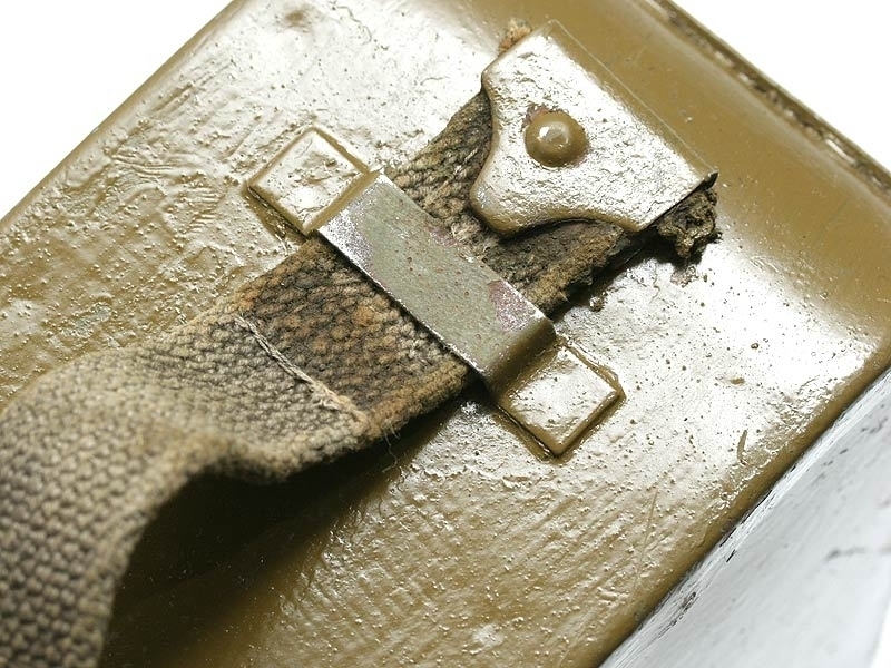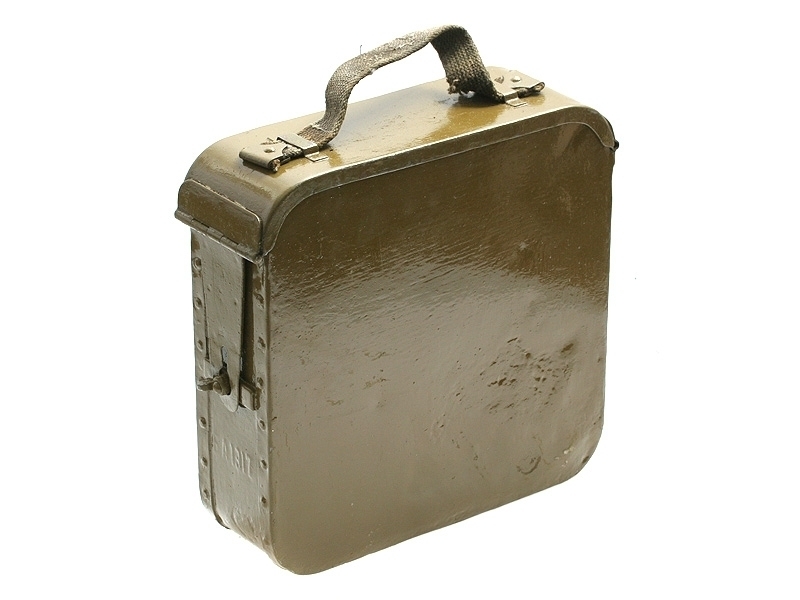 Металлический патронный ящик для лент к станковому пулемету Максим в очень хорошем состоянии. Хранился на советских военных складах, поэтому поверхность покрыта многочисленными слоями армейской зеленой краски. Под красочным слоем присутствуют рельефные клейма "Б.А.1917". Ящик укомплектован советской пулеметной лентой.