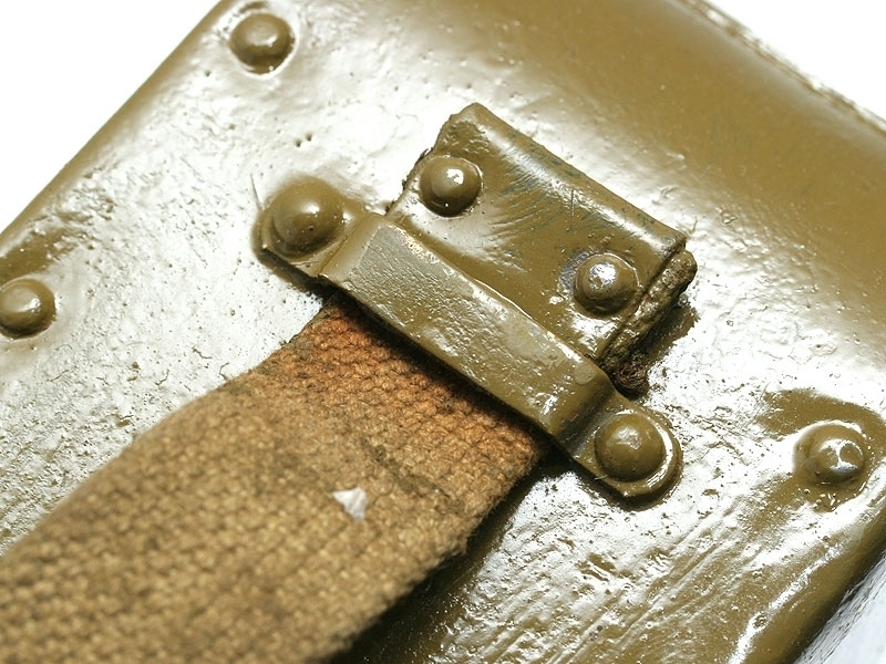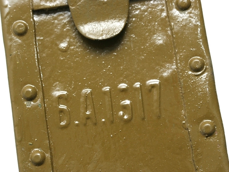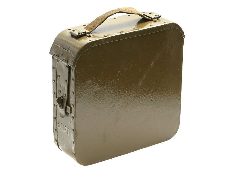Металлический патронный ящик для лент к станковому пулемету Максим в очень хорошем состоянии. Хранился на советских военных складах, поэтому поверхность покрыта многочисленными слоями армейской зеленой краски. Под красочным слоем присутствуют рельефные клейма "Б.А.1917". Ящик укомплектован советской пулеметной лентой.