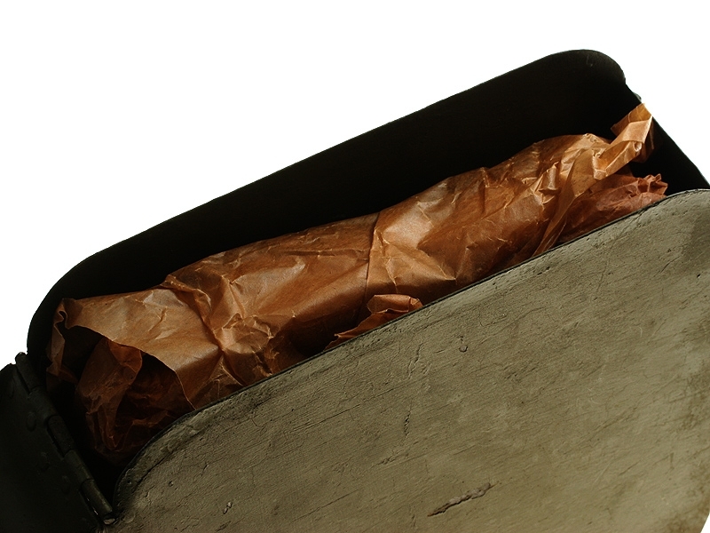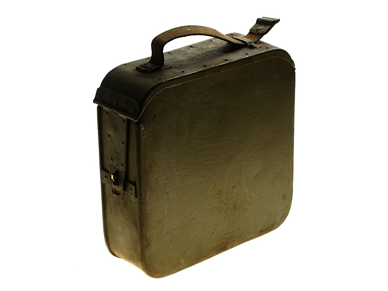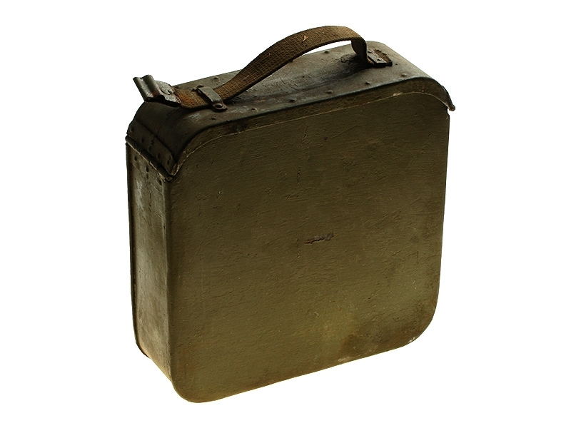 Металлический патронный ящик для лент к станковому пулемету Максим в очень хорошем состоянии. Использовался и в Красной Армии, хранился на советских военных складах, поэтому поверхность покрыта многочисленными слоями армейской зеленой краски. Ящик укомплектован советской пулеметной лентой.