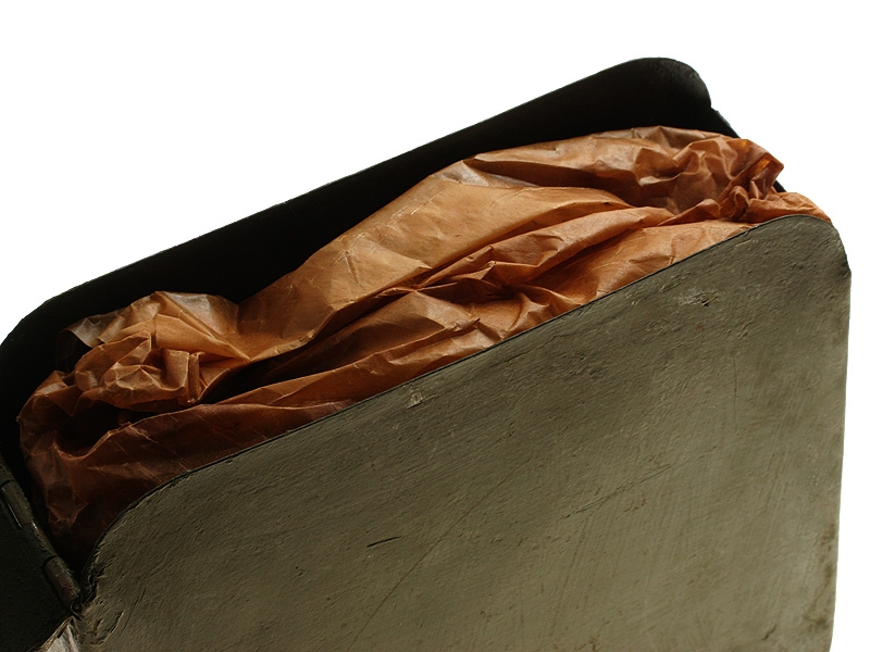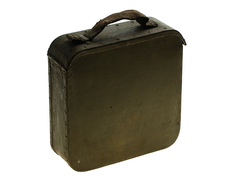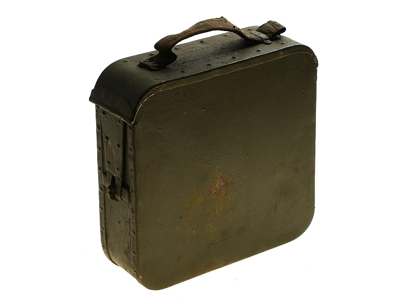 Металлический патронный ящик для лент к станковому пулемету Максим в очень хорошем состоянии. Использовался и в Красной Армии, хранился на советских военных складах, поэтому поверхность покрыта многочисленными слоями армейской зеленой краски. Ящик укомплектован советской пулеметной лентой.