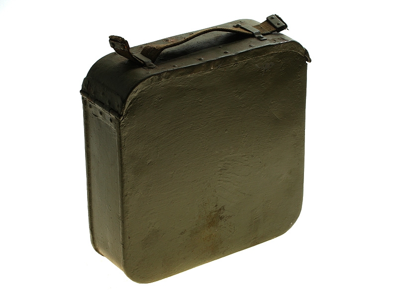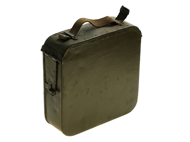 Металлический патронный ящик для лент к станковому пулемету Максим в очень хорошем состоянии. Использовался и в Красной Армии, хранился на советских военных складах, поэтому поверхность покрыта многочисленными слоями армейской зеленой краски. Ящик укомплектован советской пулеметной лентой.