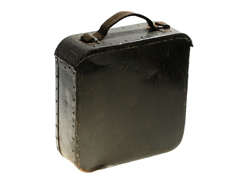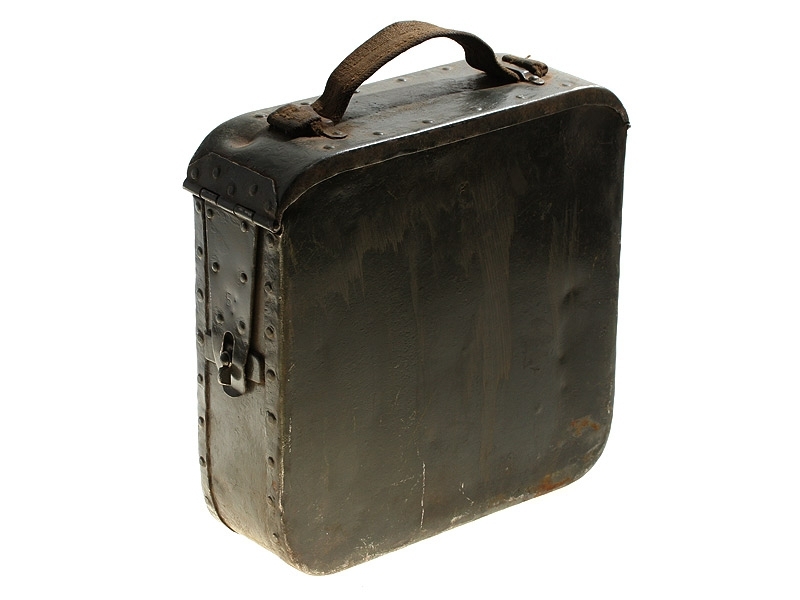 Металлический патронный ящик для лент к станковому пулемету Максим в очень хорошем состоянии. Использовался и в Красной Армии, хранился на советских военных складах, поэтому поверхность покрыта многочисленными слоями армейской зеленой краски.