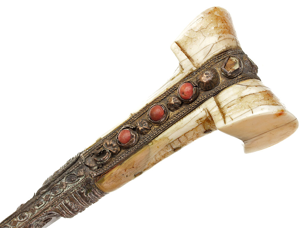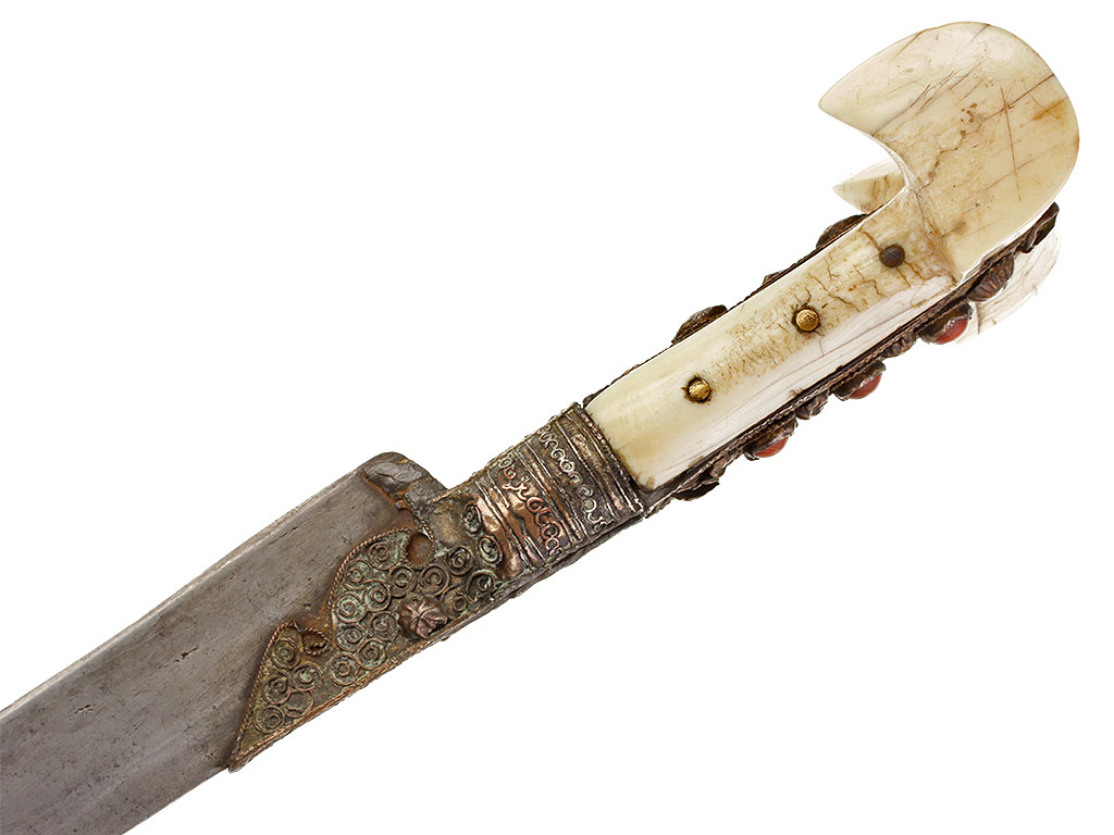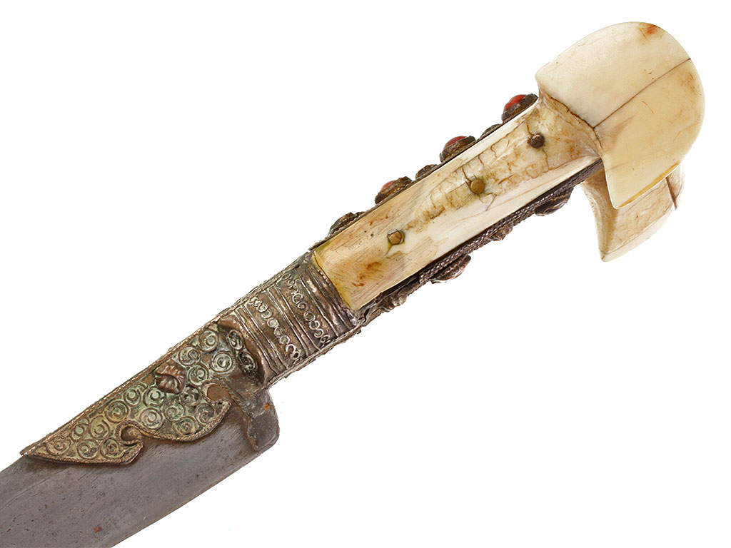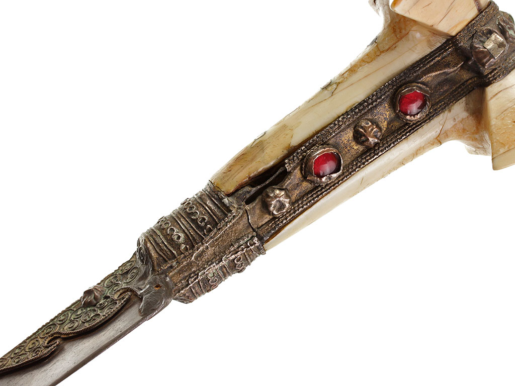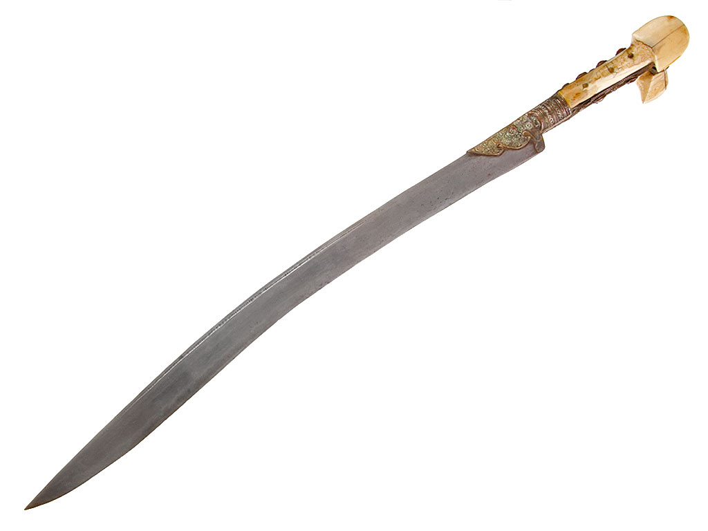 Клинок характерной изогнутой формы, с одним узким долом, идущим вдоль обуха клинка. Рукоять образована двумя массивными накладками из слоновой кости, металлический прибор рукояти посеребрен и украшен вставками из ограненных цветных камней.