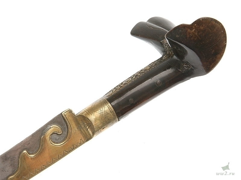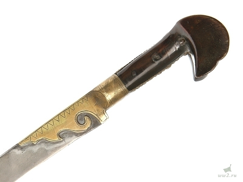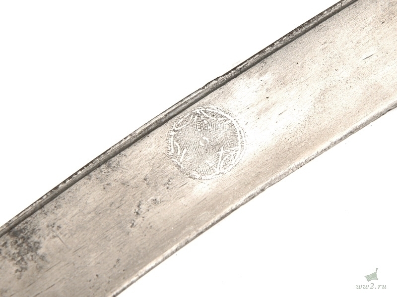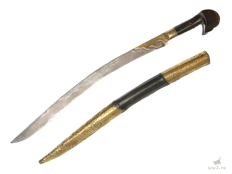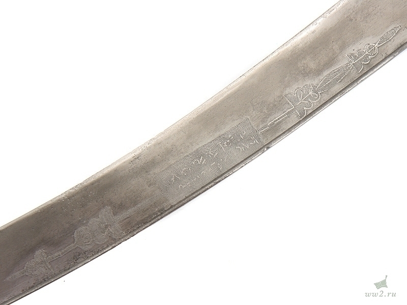 Описание: Клинок стальной, неправильной изогнутой формы, с латунным позолоченным «наплывом» у пяты, украшенным треугольными насечками. На клинке нанесен орнамент с картушем посередине, на котором расположены полузатертые арабские надписи. Рукоять деревянная, с «ушами». Рукоять крепится к черенку клинка при помощи трех заклепок. Спинка рукояти накрыта латунной пластиной, на которой множественные точечные вмятины. Черенок клинка закрыт стальными орнаментированными пластинами. Ножны деревянные, обтянутые черной кожей, с латунным вызолоченным прибором, состоящим из устья и наконечника, которые покрыты множественными точечными «вмятинками» и украшены изображениями пятиконечных звезд в круге.
