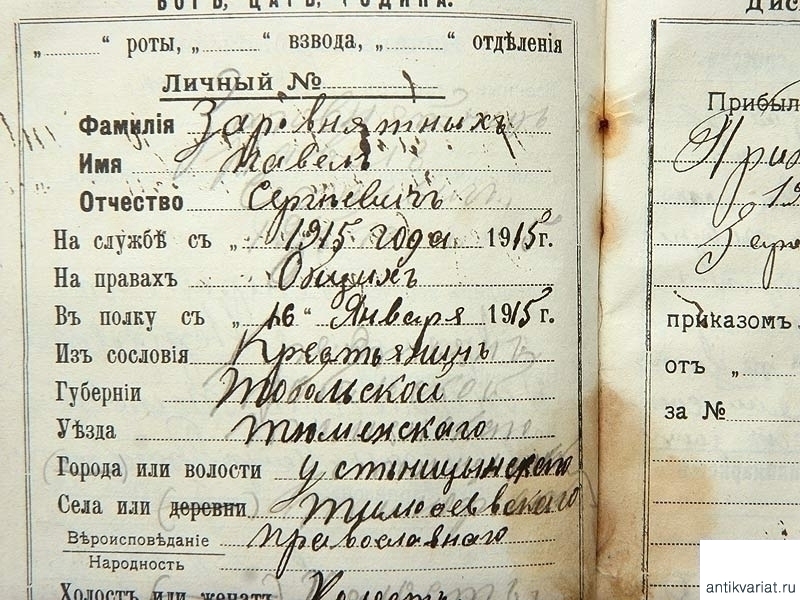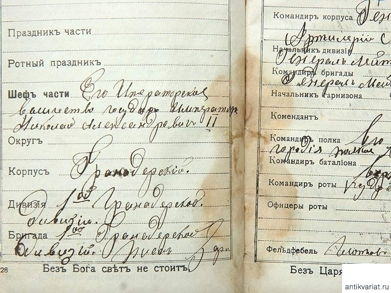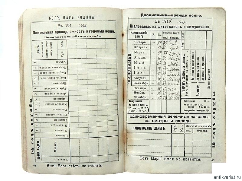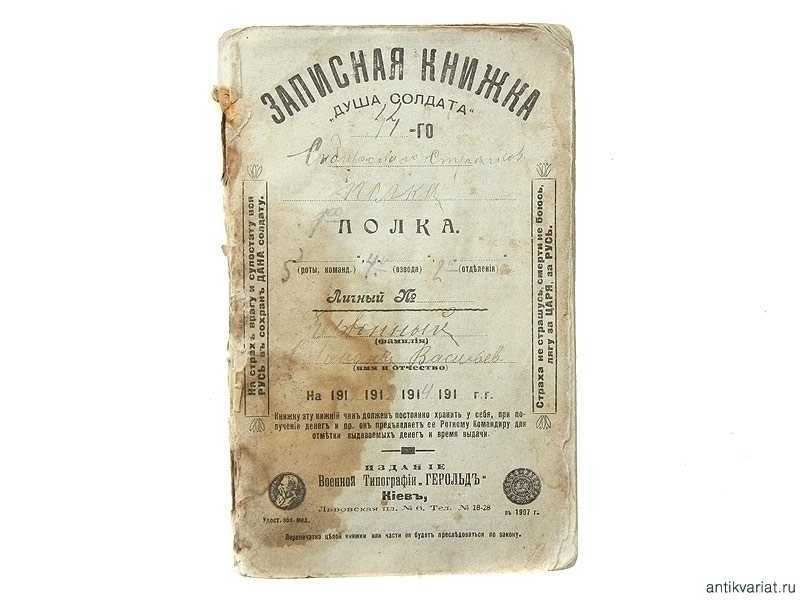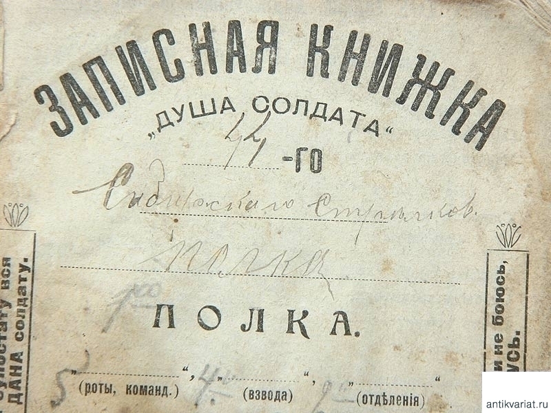 Записная книжка "Душа солдата", выданная рядовому 2-го отделения 4-го взвода 5-й роты 44-го Сибирского стрелкового полка Червонному Степану Васильевичу. Книжка выдана на 1913 - 1914 год, содержит, кроме описания строевых и ружейных приемов, сведения о России, Императорской семье, сведения общего характера, необходимые солдату.