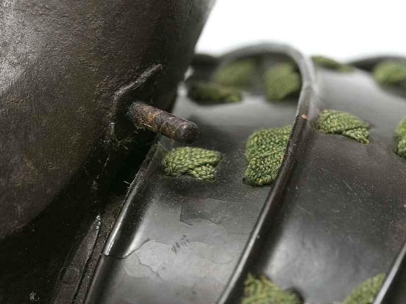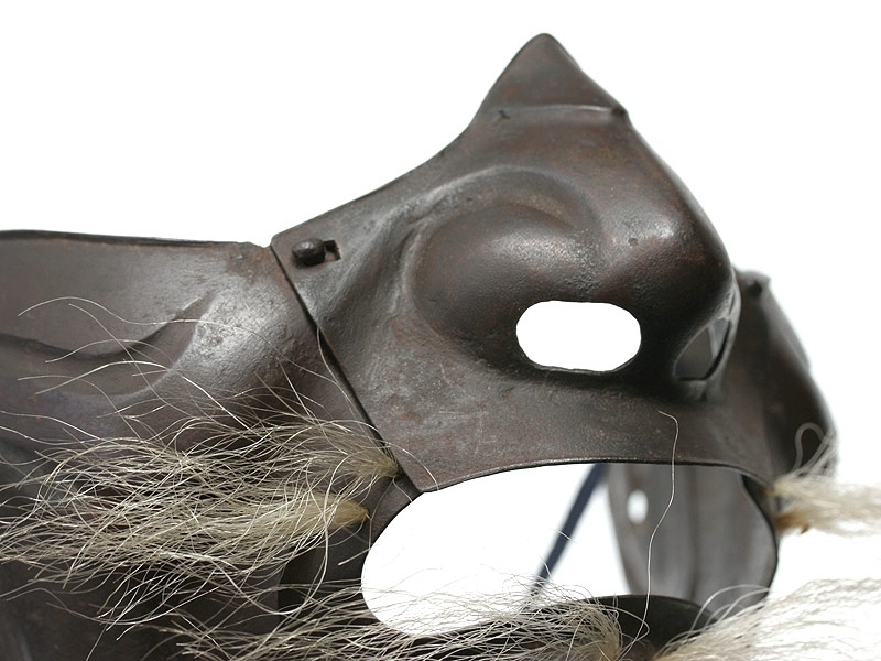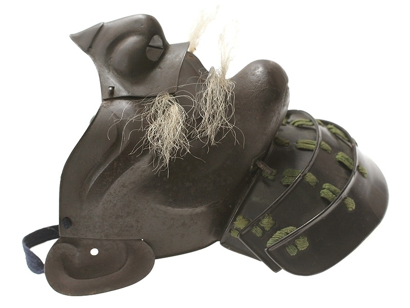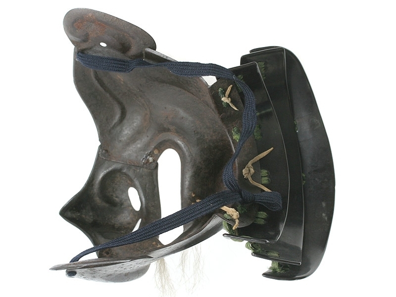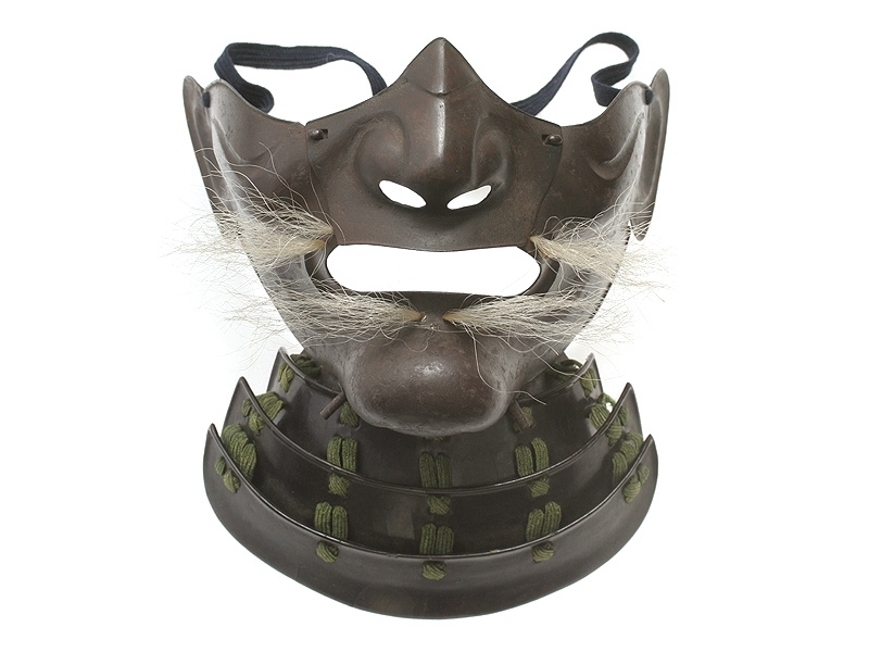 Защитная маска мэмпо, изготовленная около 1750 года. Состоит из кованых железных деталей, пластины, закрывающие шею, также изготовлены из покрытого толстым слоем черного лака железа. В средневековой Японии имелись различные разновидности мэмпо — от простой металлической пластины, закрывающей подбородок (хоатэ), до настоящей маски, закрывающей все лицо (сомэн). Наиболее популярной разновидностью была полумаска, закрывающая подбородок и щеки, иногда с элементом защиты носа, и с отверстием для рта. Поскольку маска служила также для поддержания шлема, она снабжалась крючками, через которые пропускались его крепежные шнуры. Маске зачастую придавались черты человеческого лица с усами.