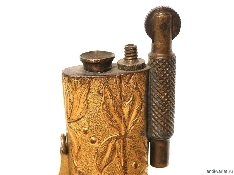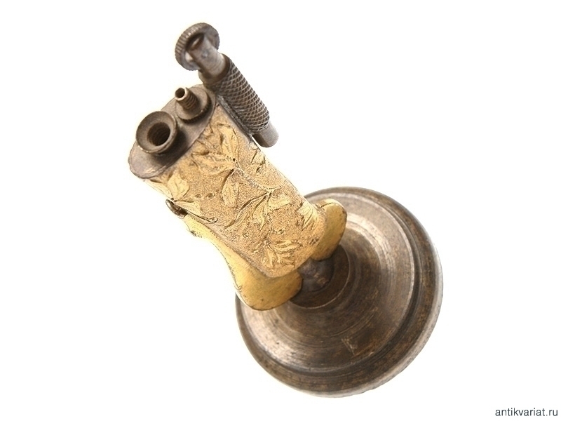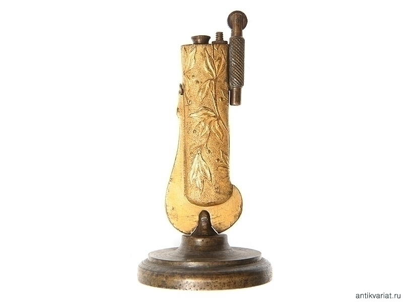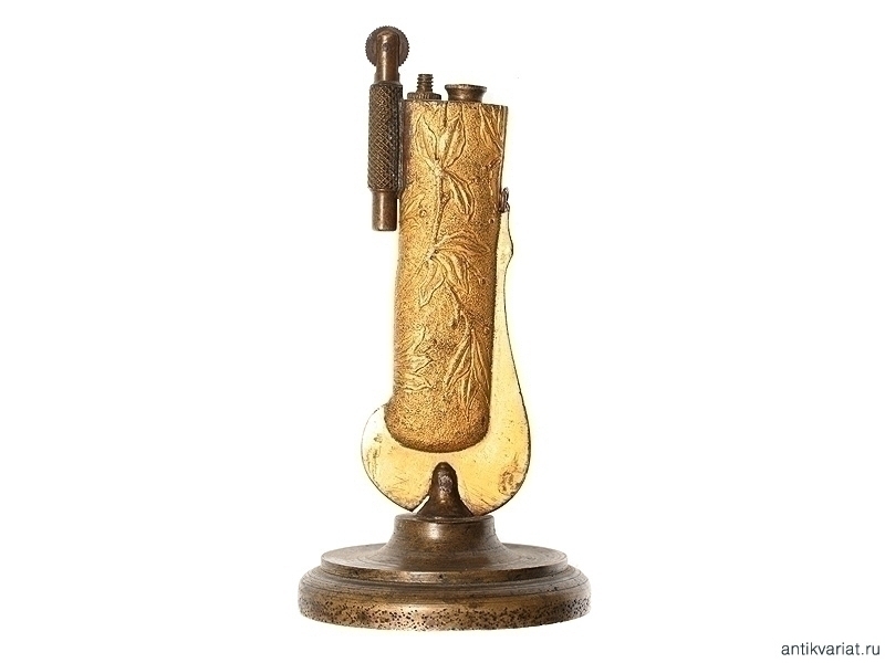 Бензиновая настольная зажигалка, изготовленная из наконечника ножен морской офицерской сабли - Золотого Оружия "За храбрость". Наконечник ножен украшен рельефным растительным орнаментом, практически полностью сохранилось оригинальное золочение. Массивная подставка изготовлена из бронзы. Высота 15,8 см.