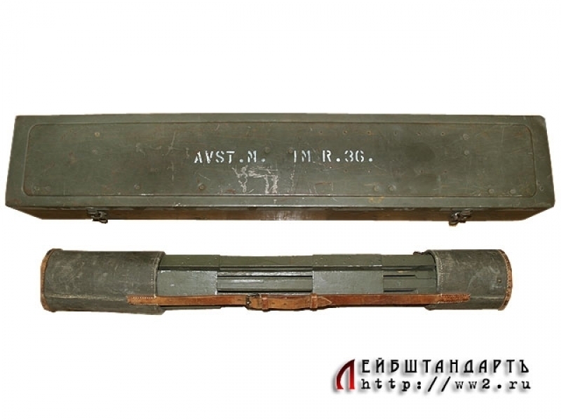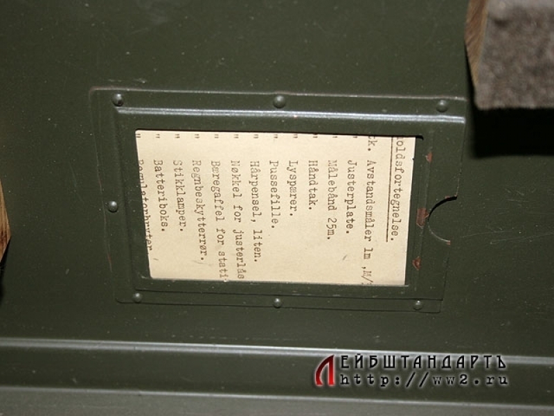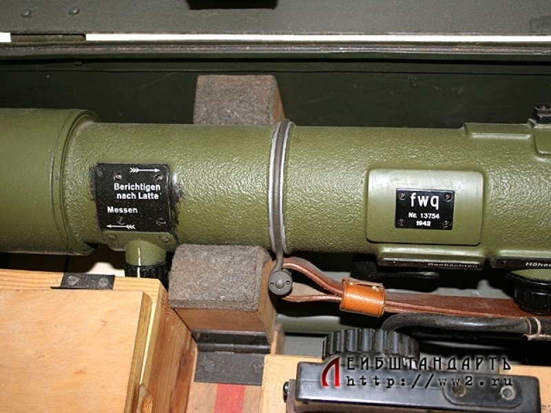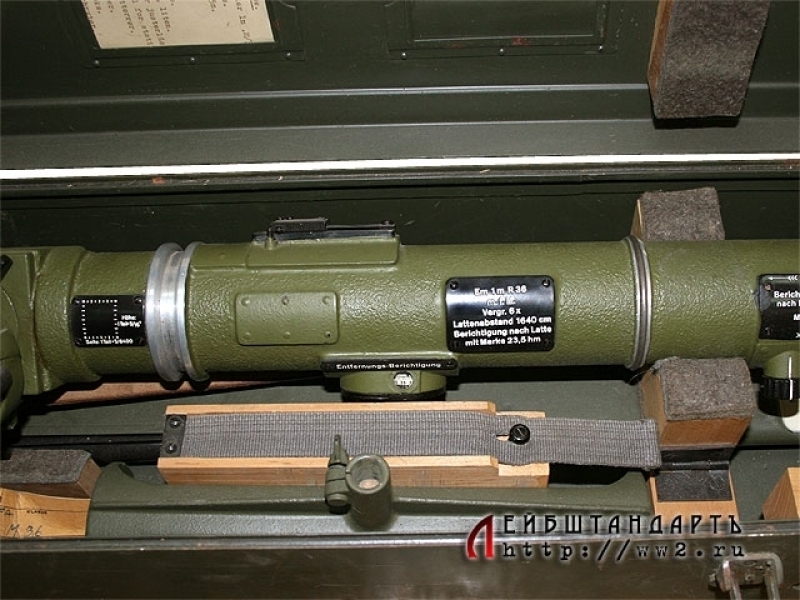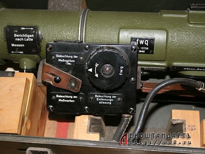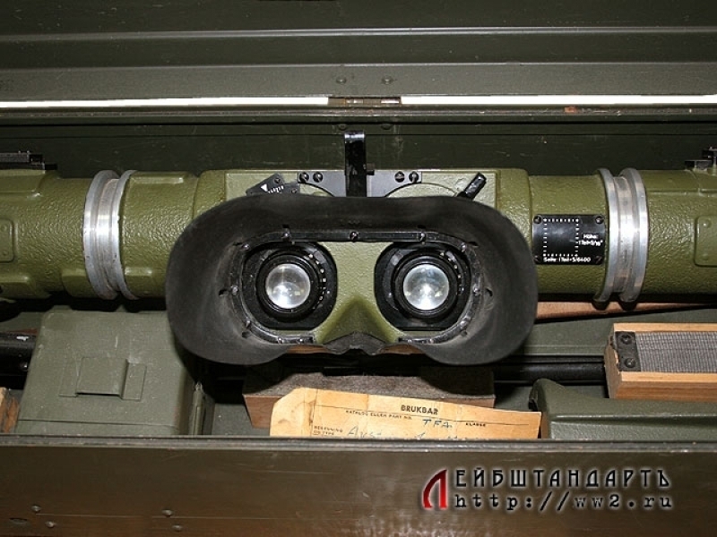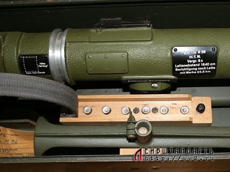 Зенитный артиллерийский дальномер немецкого производства, изготовленный в 1942 году. Прибор в полной комплектности, представляющий собой начиненную оптикой трубу с боковым окуляром, упакованную в оригинальную металлическую коробку размером 118 на 21 см. При эксплуатации он крепится на складную треногу, которая прилагается к комплекту. Состояние практически идеальное, прибор, футляр и тренога в оригинальном защитном красочном покрытии, присутствуют все накладные таблички с клеймами; создается впечатление, что дальномером почти не пользовались. Найти столь сложный оптический прибор (тем более таких внушительных габаритов) в таком идеальном состоянии удается крайне редко.