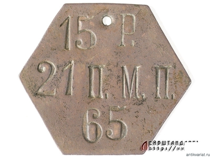 Личный жетон солдата 15 роты 21 пехотного Муромского полка в очень хорошем состоянии. Предмет археологического происхождения, найден на местах боев под Танненбергом, где Муромский полк был уничтожен практически полностью.