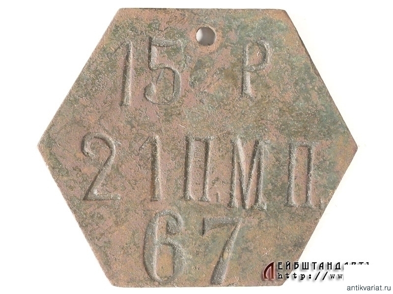 Личный жетон солдата 15 роты 21 пехотного Муромского полка в очень хорошем состоянии. Предмет археологического происхождения, найден на местах боев под Танненбергом, где Муромский полк был уничтожен практически полностью.