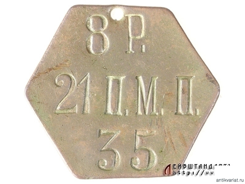 Личный жетон солдата 8 роты 21 пехотного Муромского полка в очень хорошем состоянии. Предмет археологического происхождения, найден на местах боев под Танненбергом, где Муромский полк был уничтожен практически полностью.