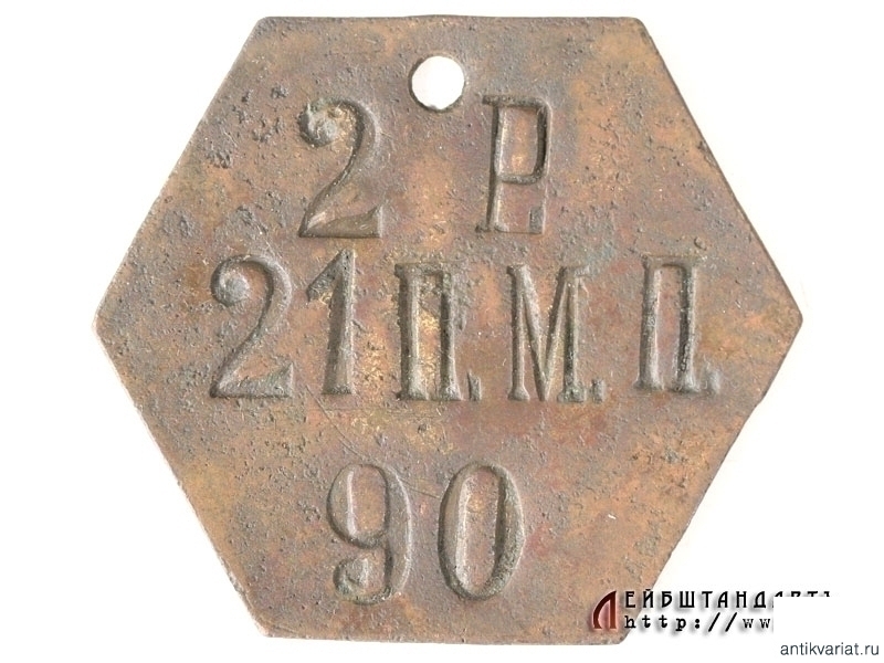 Личный жетон солдата 2 роты 21 пехотного Муромского полка в очень хорошем состоянии. Предмет археологического происхождения, найден на местах боев под Танненбергом, где Муромский полк был уничтожен практически полностью.