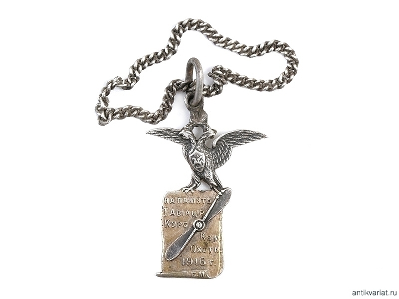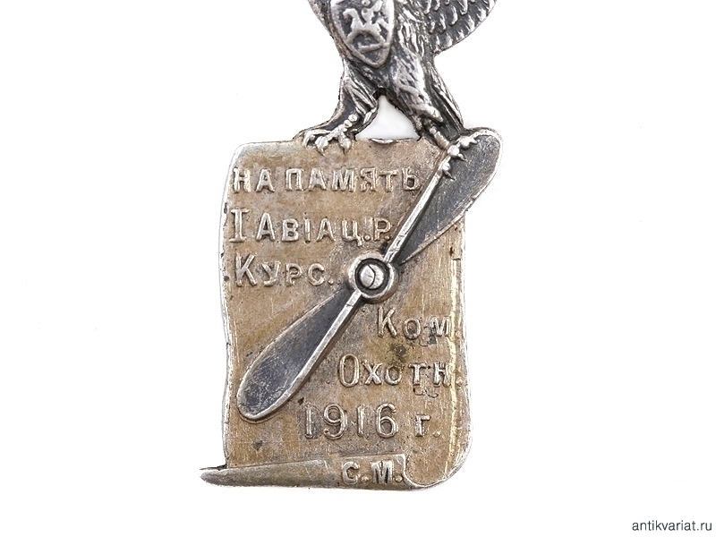 Жетон к призовым часам военного летчика Императорской армии. Изготовлен из позолоченного серебра. На щитке имеется надпись: "На память. 1 авiацiонные курсы, команда охотниковъ. 1916 годъ". Очень хорошее состояние. Редкий.
