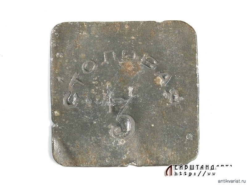 Цинковый жетон из армейской солдатской столовой. Изготовлен штампом из листового цинка, сырьем для производства жетонов, вероятнее всего, послужили использованные цинки для патронов. Штампом нанесена надпись: "Столовая 3". Очень хорошее состояние.