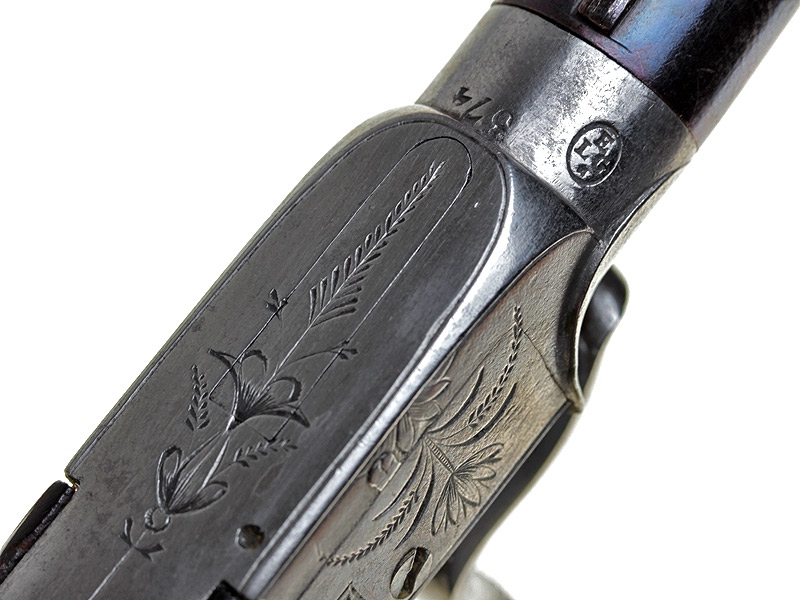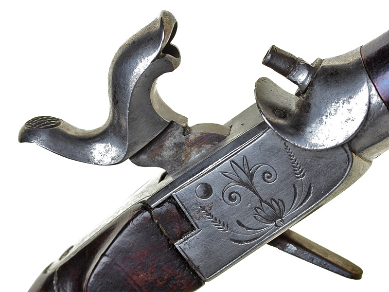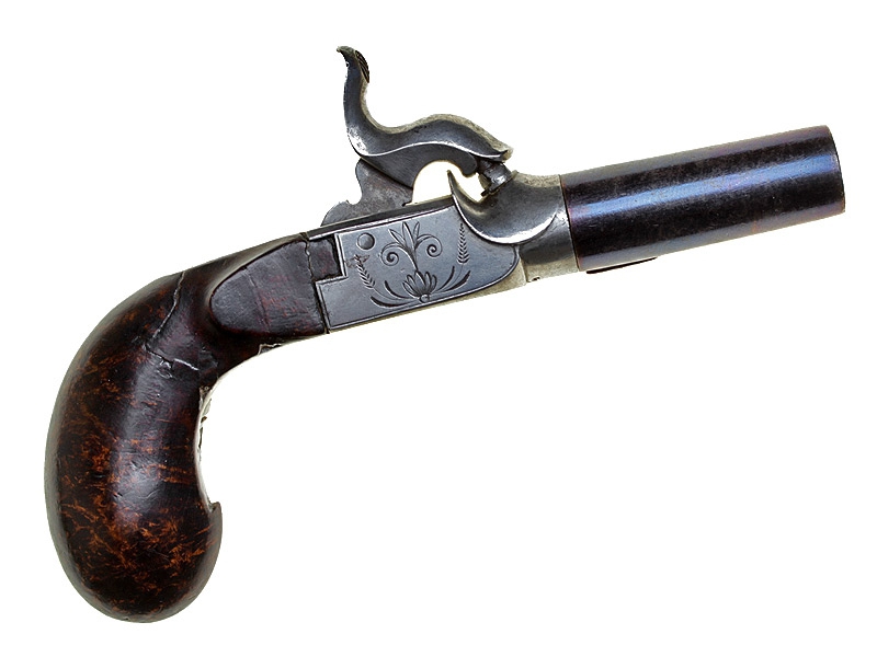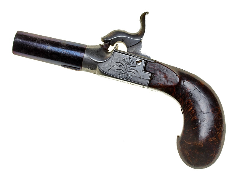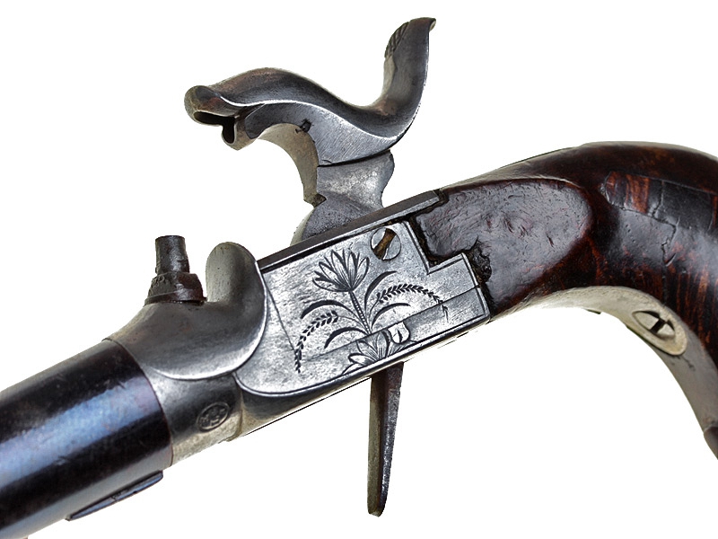 Миниатюрный жилетный пистолет с капсюльным замком, изготовленный в середине XIX века - классическое оружие самообороны для гражданских лиц. Ствол отвинчивается (для удобства чистки), имеется клеймо фабрики в Льеже. Рама с обеих сторон украшена гравированным орнаментом. Сам ствол очень красивый, покрыт ярким синим воронением. Рукоять из дерева, ничем не украшена. Спусковой крючок раскладывается при полном взведении курка. Механизм полностью исправен, очень хорошее состояние.