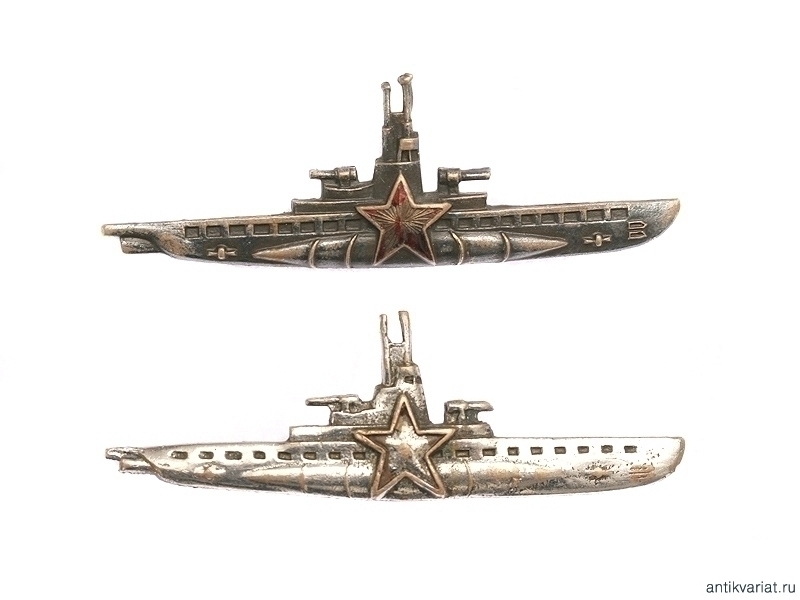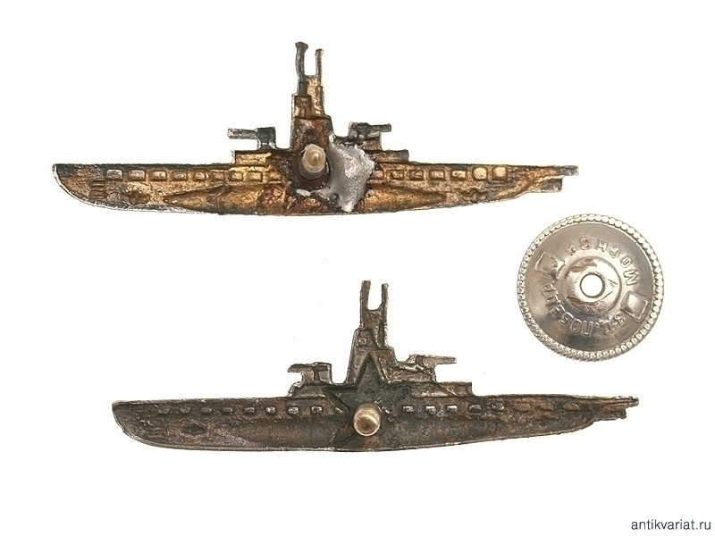 Значок в виде миниатюрного подводного корабля с эмалированной накладкой-звездой.