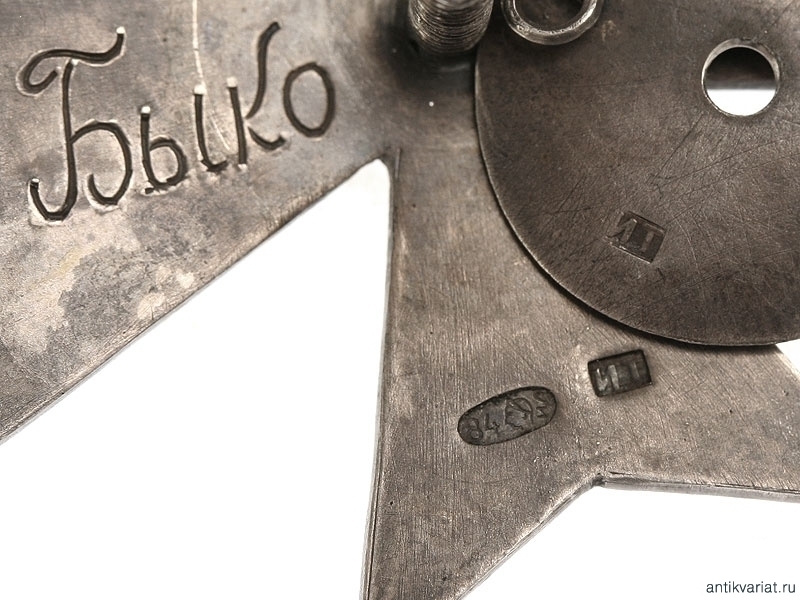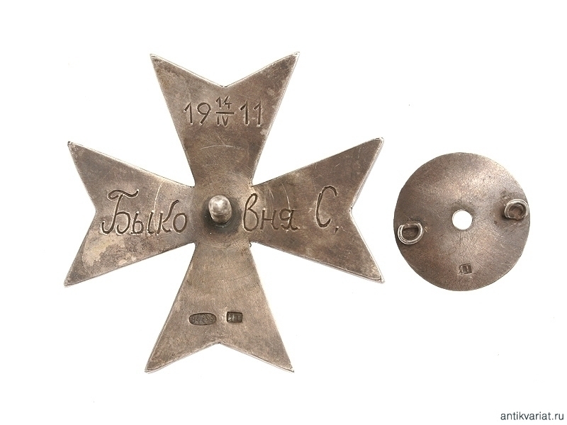 Начало ХХ века, неизвестная мастерская. На обороте гравировка: "19 14/ IV11 Быковня С." Клейма: пробирное в овале "84", головка влево, "ИЛ"; именное "ИТ" в прямоугольном щитке; на закрутке именное "ИТ".