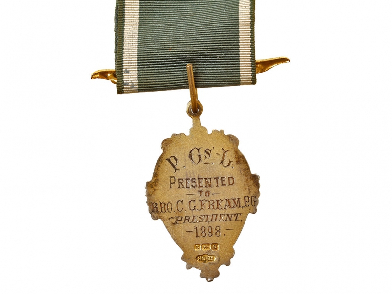 Масонский знак, серебро, золочение, эмаль. На оборотной стороне - клейма пробирного надзора и именная гравировка, датированная 1898 годом.