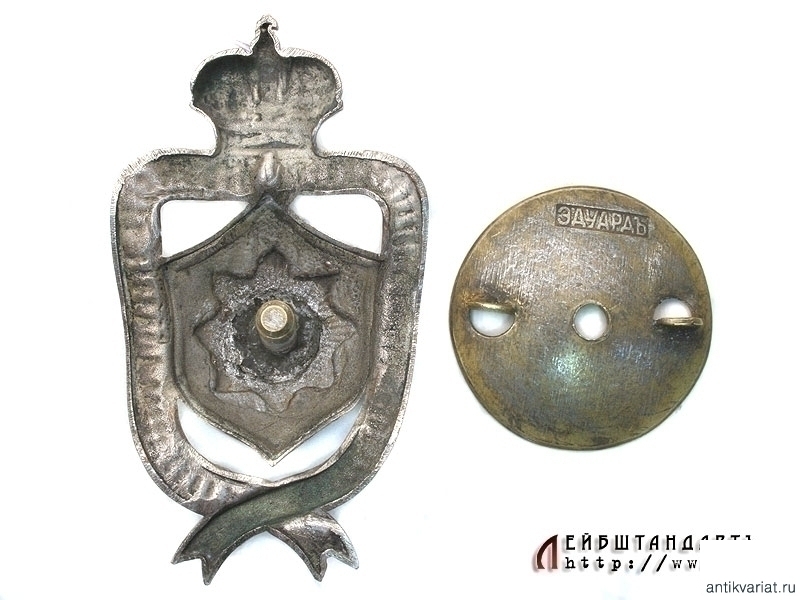 Знак для нижних чинов "За беспорочную службу въ Собственномъ Его Императорскаго Величества Сводно-пехотномъ полку" в очень хорошем состоянии. Представляет собой сложенную латунную посеребренную ленту с надписью "Собственный Его Императорского Величества Сводный пех. полкъ", в центре помещен геральдический щит с Андреевской звездой (эмалевое изображение отсутствует). Знак на винте, сохранилась оригинальная закрутка с клеймом фирмы "Эдуардъ".