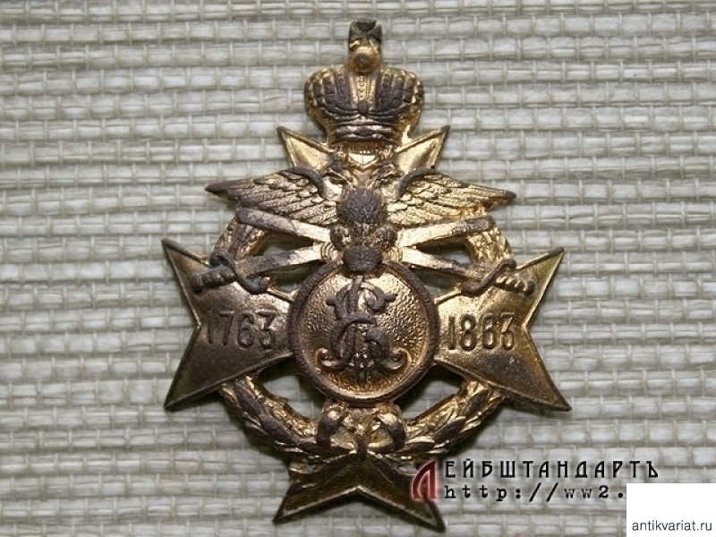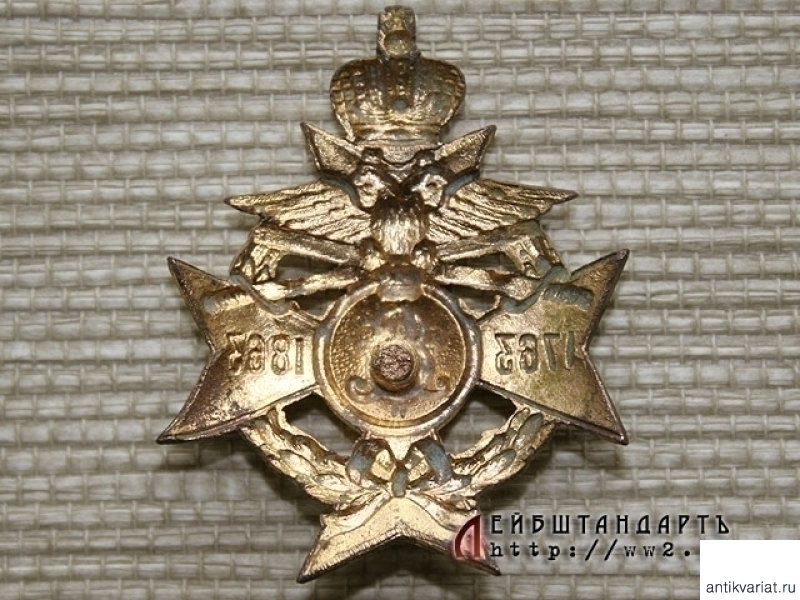 Знак 186 пехотного Асландузского полка. Представляет собой Мальтийский крест, увенчанный императорской короной. В центре креста расположен медальон с совмещенным вензелем Екатерины Второй и Александра Второго. Крест наложен на круглый венок из лавровых ветвей, на верхнем луче креста расположен двуглавый орел, сжимающий в лапах два скрещенных меча. На горизонтальных лучах креста даты: "1763" и "1863". Знак крепится к мундиру при помощи винта, который частично обломан. Судя по тому, что офицерские знаки этого полка были эмалевыми, а солдатские латунными, можно предположить, что данный позолоченный экземпляр принадлежал кому-либо из унтер-офицеров или вольноопределяющихся. Достаточно редкий знак, тем более в таком заказном исполнении.