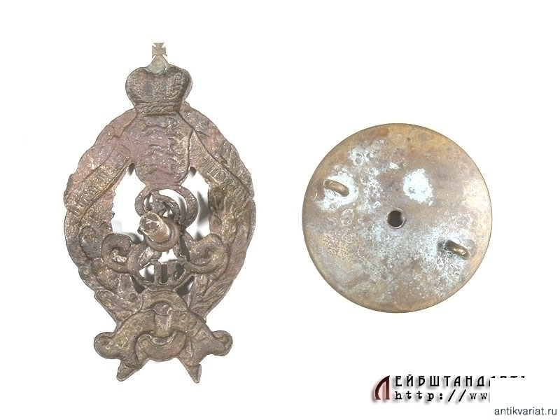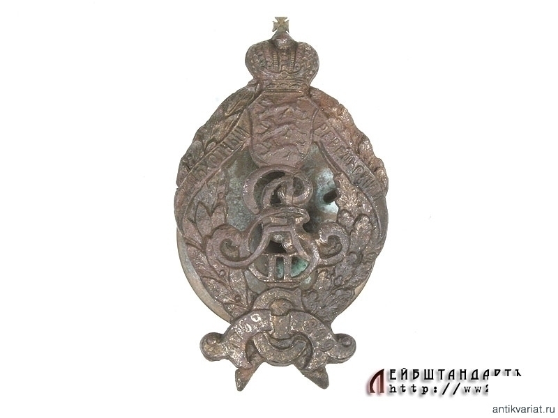Знак 7-го пехотного Ревельского полка для нижних чинов в средней степени сохранности. В центре венка из лавровых и дубовых листьев помещен совмещенный вензель Екатерины II и Александра II, над которым находится герб города Ревеля (Таллинна). Знак латунный, контррельефный, на винте. Закрутка присутствует.