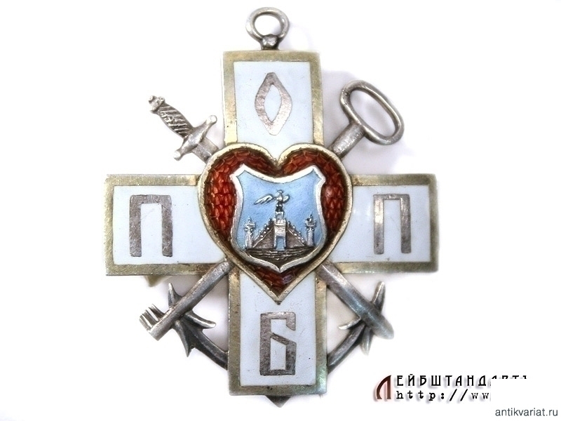 Знак Орловского православного Петропавловского Братства I степени в отличной сохранности. Представляет собой равносторонний прямой крест, покрытый эмалью белого цвета. На лучах креста расположены буквы "О.П.П.Б." - сокращенное название Братства. Изображение креста наложено на силуэты якоря, ключа и меча - символы небесных покровителей Братства святых апостолов Петра и Павла. В центре расположено сердце, покрытое красной эмалью по гильошированной поверхности, а на нем изображен герб Орловской губернии - на голубом фоне крепость с орлом вверху.