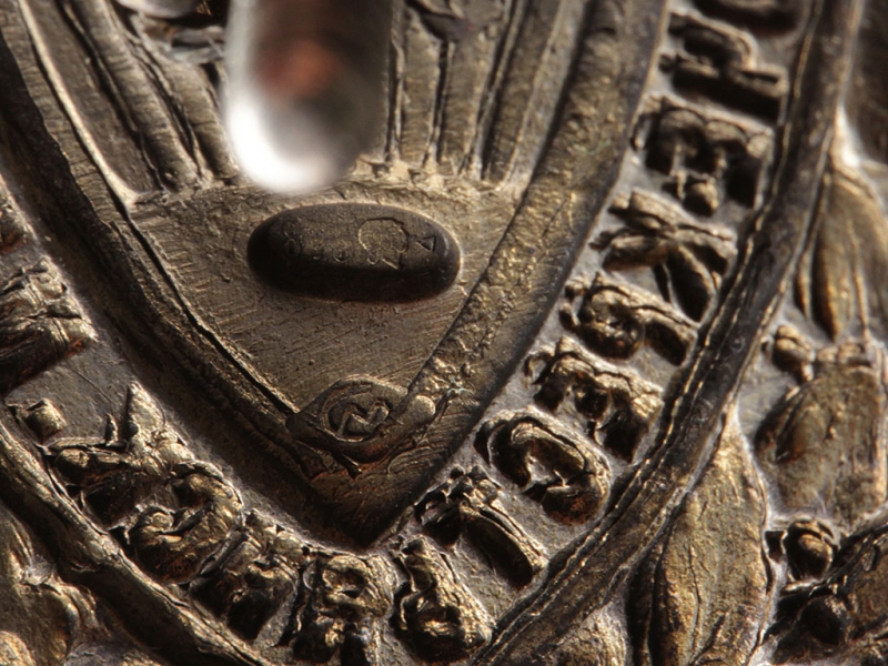 Знак "Х лет РКМ", Москва, 1927 год. Неизвестная мастерская. Клейма: на оборотной стороне знака под винтом – Московского окружного пробирного управления с пробой металла "875, голова рабочего, вправо, дельта" в овальном щитке и именное "СМ". Закрутка и подложка - от другого знака. Серебро, позолота, эмаль. Сохранность хорошая, имеется скол эмали на знамени слева. Учрежден правительством РСФСР 10 октября 1927 года. Серебряными знаками награждались сотрудники милиции с непрерывным стажем работы от 7 до 10 лет.