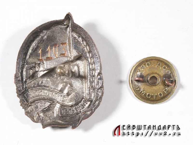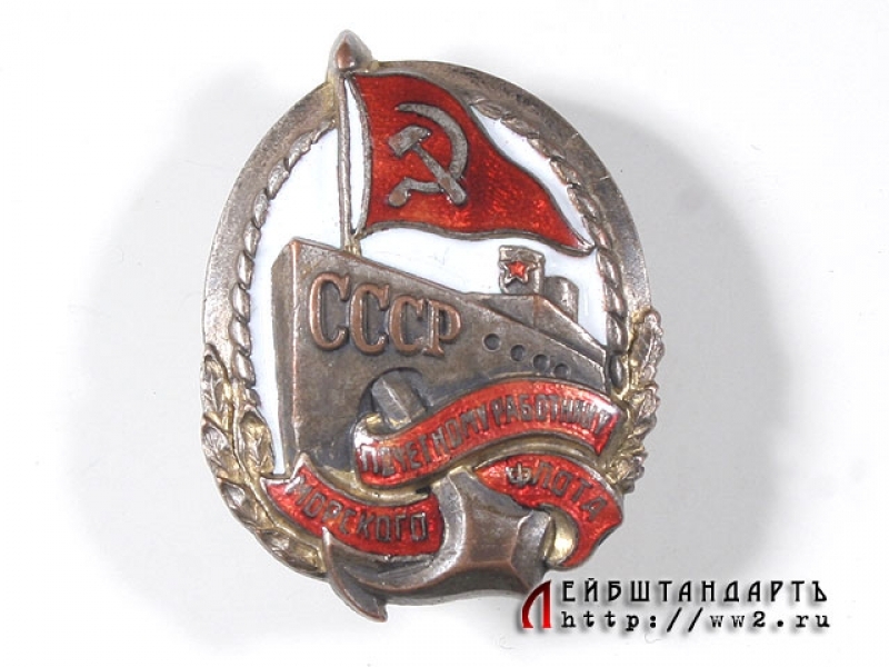 Знак "Почетному работнику морского флота" выпуска 1930-х годов в отличной сохранности. Изготовлен из посеребренной и позолоченной латуни и покрыт белой и красной эмалью. Эмалевое покрытие без сколов и чешуек. Знак контррельефный, на реверсе имеется штихельный номер "1103". Винтовой, с оригинальной закруткой.