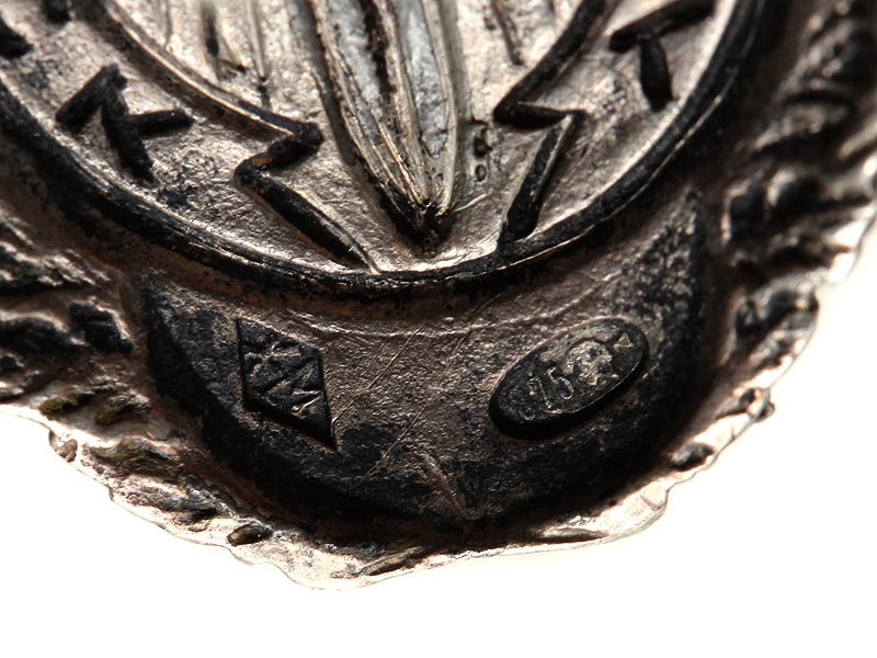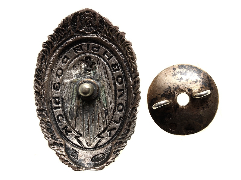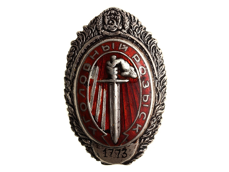 Должностной знак сотрудника отдела уголовного розыска Центрального административного управления НКВД РСФСР № 1773. Москва, середина 1920-х годов, мастерская "Худмет"(?). На лицевой стороне знака внизу вырезан номер: "1773". Клейма: на оборотной стороне знака внизу – Московского окружного пробирного управления с пробой металла в овальном щитке (875, голова рабочего, вправо, дельта) и именное клеймо "Х.М" в щитке в форме ромба. Серебро, эмаль. Сохранность хорошая, сколы эмали, крепление переделано на винтовое. Закрутка подобрана от дореволюционного знака.
