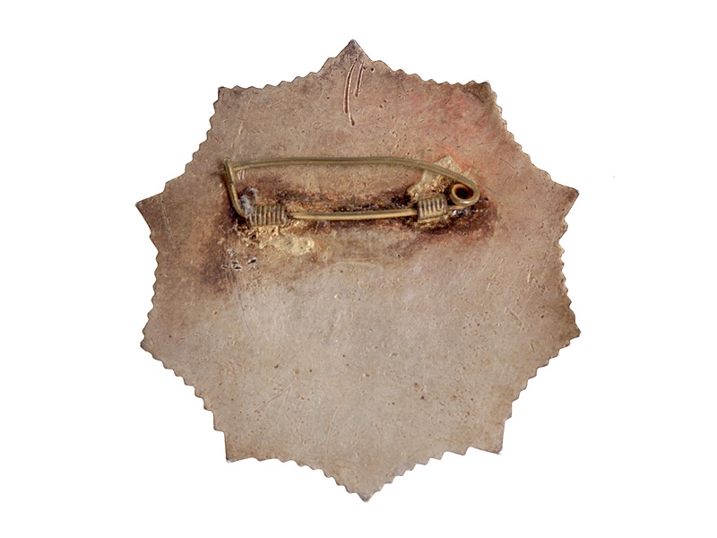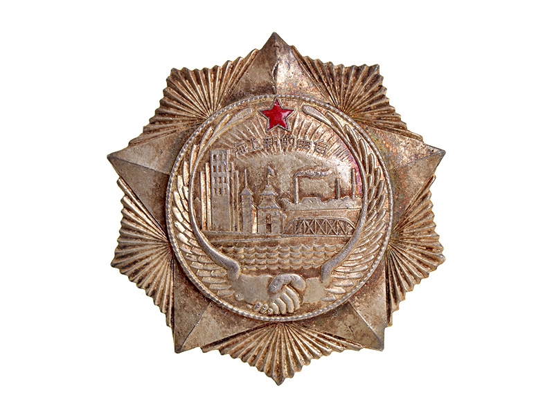 Знак представляет собой пятиконечную звезду с сиянием между лучами. В центральном медальоне - изображение городского пейзажа Нового Шанхая со стороны реки Хуанпу, снизу обрамлённое изображением "крылатых рук", сомкнутых в рукопожатии; вверху красная пятиконечная эмалевая звёздочка и надпись иероглифами: "За оборону Нового Шанхая". Серебро, позолота. Очень хорошее состояние.