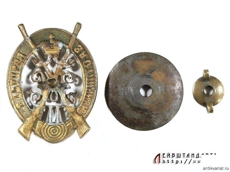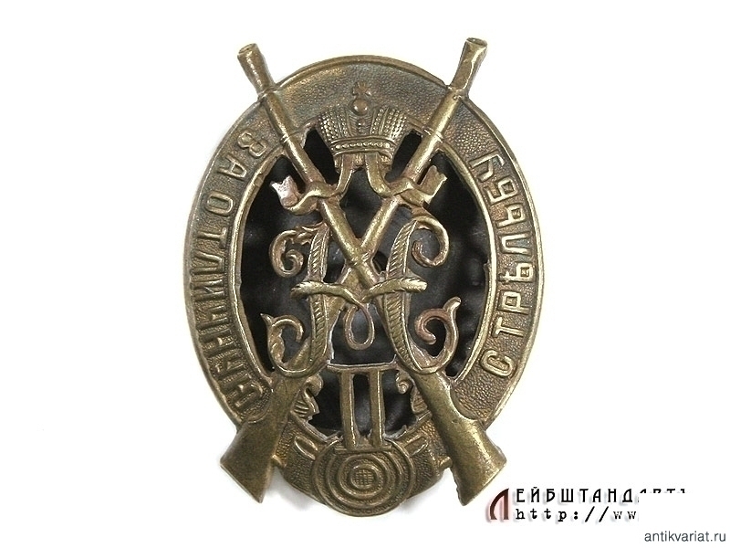 Знак "За отличную стрельбу" I степени для нижних чинов в очень хорошей сохранности. Изготовлен из бронзы, на винте, сохранились оригинальная закрутка и прижимная пластина. В центре знака помещен вензель Императора Николая Второго на фоне скрещенных ружей. Такие знаки носились награжденным на груди либо, чаще, непосредственно на ремне винтовки.