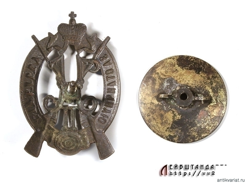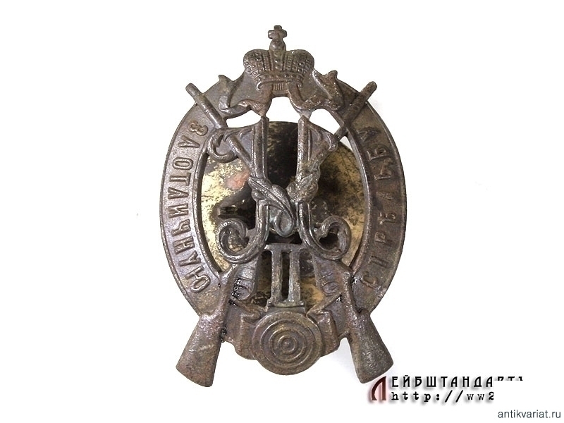 Знак "За отличную стрельбу" I степени для нижних чинов в очень хорошей сохранности. Изготовлен из бронзы, на винте. В центре знака помещен вензель Императора Николая Второго на фоне скрещенных ружей. Такие знаки носились награжденным на груди либо, чаще, непосредственно на ремне винтовки.
