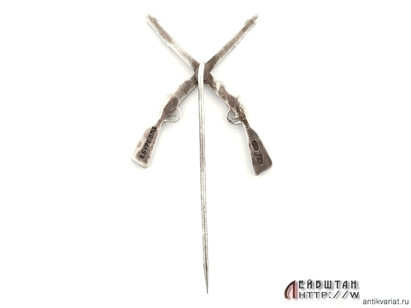 Знак "За стрельбу" в виде скрещенных винтовок. Серебро 84 пробы, дополнительное клеймо часовой фирмы "Павелъ Буре". 1910-е годы. Очень хорошее состояние.