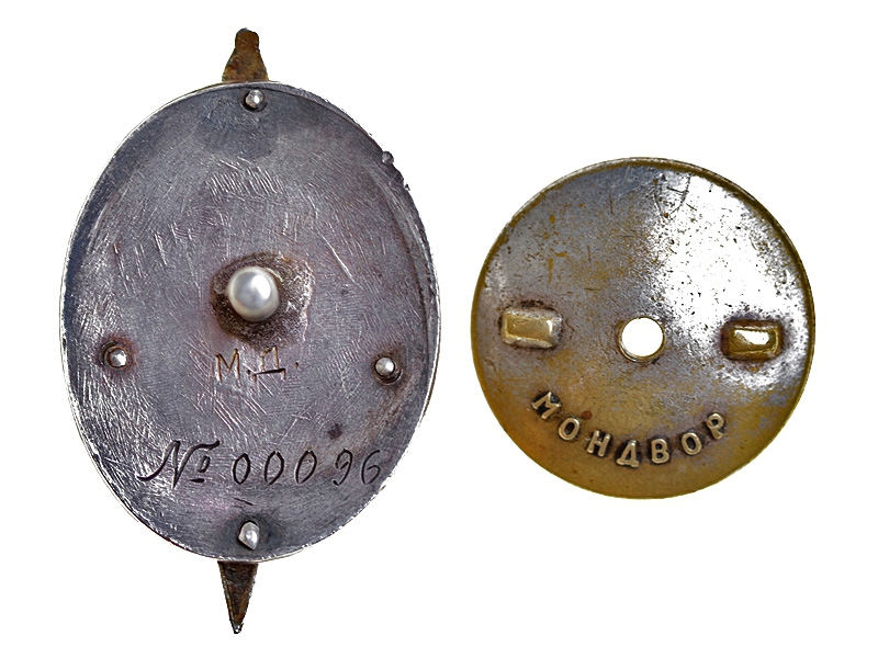 Сохранность очень хорошая, эмаль слева на ленте имеет скол. На оборотной стороне знака по винтом вырезаны буквы: "М.Д." и ниже – номер: "№ 00096". На гайке в нижней части надпись по окружности в одну строку: "МОНДВОР" (это особенность знаков раннего выпуска - знаки с более крупными номерами (более 120) имеют гайку с надписью в две строки "МОНЕТНЫЙ ДВОР"). Эмаль фона без повреждений, винт не укорочен.