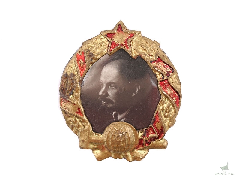 Знак с портретом В.И.Ленина, середина 1920-х годов. Латунь, красный лак, фото закрыто целлулоидной пластинкой. Очень хорошее состояние.