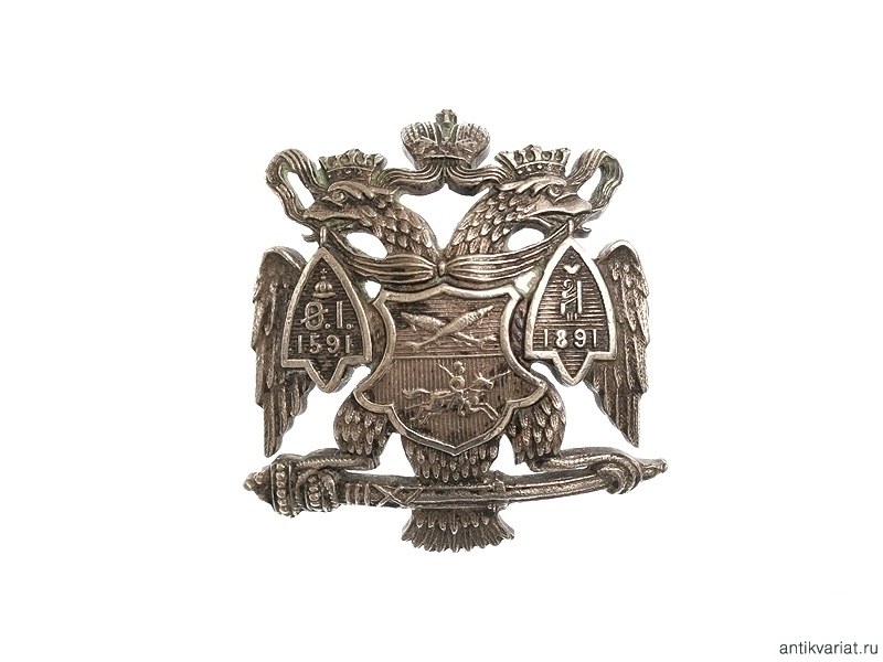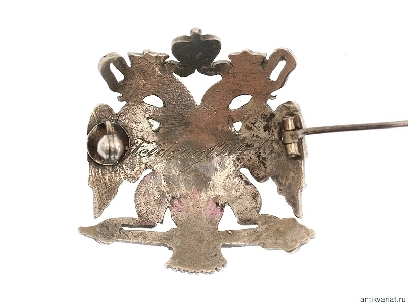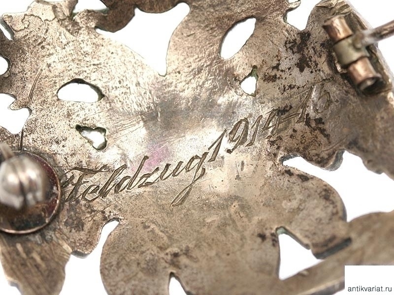 Знак нижних чинов Уральского казачьего войска, доставшийся немецкому солдату в качестве трофея во время Первой мировой войны. Белый металл. На обороте нанесена немецкая памятная надпись - военный поход 1914-15 года (Feldzug 1914-15), удален винт и припаяна заколка: знак был использован в качестве броши. Редкий знак переживший Великую войну и попавший к немецкому солдату.